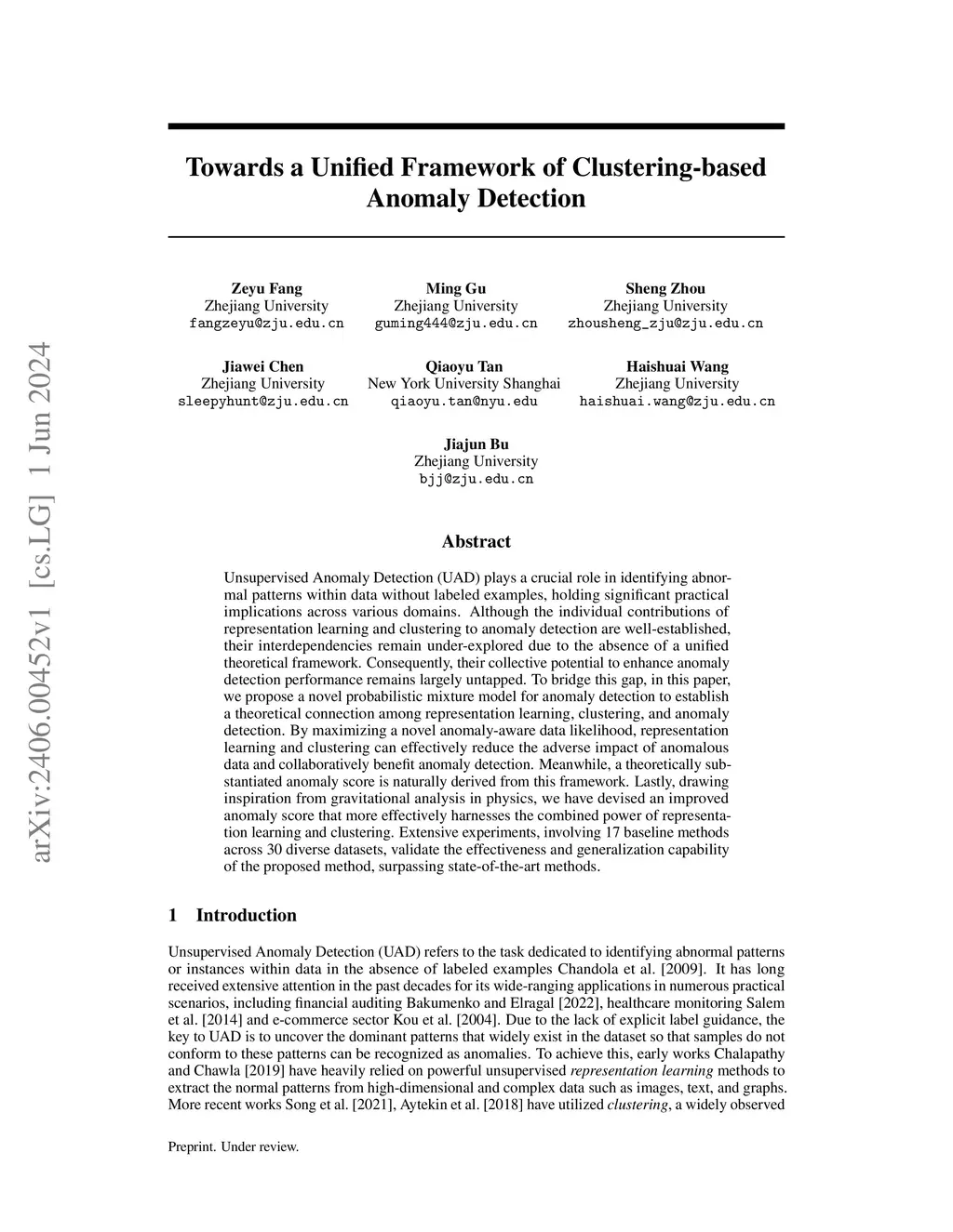 Unsupervised Anomaly Detection (UAD) plays a crucial role in identifying abnormal patterns within data without labeled examples, holding significant practical implications across various domains. Although the individual contributions of representation learning and clustering to anomaly detection are well-established, their interdependencies remain under-explored due to the absence of a unified theoretical framework. Consequently, their collective potential to enhance anomaly detection performance remains largely untapped. To bridge this gap, in this paper, we propose a novel probabilistic mixture model for anomaly detection to establish a theoretical connection among representation learning, clustering, and anomaly detection. By maximizing a novel anomaly-aware data likelihood, representation learning and clustering can effectively reduce the adverse impact of anomalous data and collaboratively benefit anomaly detection. Meanwhile, a theoretically substantiated anomaly score is naturally derived from this framework. Lastly, drawing inspiration from gravitational analysis in physics, we have devised an improved anomaly score that more effectively harnesses the combined power of representation learning and clustering. Extensive experiments, involving 17 baseline methods across 30 diverse datasets, validate the effectiveness and generalization capability of the proposed method, surpassing state-of-the-art methods.