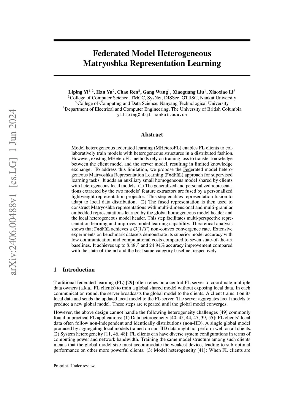 Model heterogeneous federated learning (MHeteroFL) enables FL clients to collaboratively train models with heterogeneous structures in a distributed fashion. However, existing MHeteroFL methods rely on training loss to transfer knowledge between the client model and the server model, resulting in limited knowledge exchange. To address this limitation, we propose the Federated model heterogeneous Matryoshka Representation Learning (FedMRL) approach for supervised learning tasks. It adds an auxiliary small homogeneous model shared by clients with heterogeneous local models. (1) The generalized and personalized representations extracted by the two models' feature extractors are fused by a personalized lightweight representation projector. This step enables representation fusion to adapt to local data distribution. (2) The fused representation is then used to construct Matryoshka representations with multi-dimensional and multi-granular embedded representations learned by the global homogeneous model header and the local heterogeneous model header. This step facilitates multi-perspective representation learning and improves model learning capability. Theoretical analysis shows that FedMRL achieves a non-convex convergence rate. Extensive experiments on benchmark datasets demonstrate its superior model accuracy with low communication and computational costs compared to seven state-of-the-art baselines. It achieves up to 8.48% and 24.94% accuracy improvement compared with the state-of-the-art and the best same-category baseline, respectively.