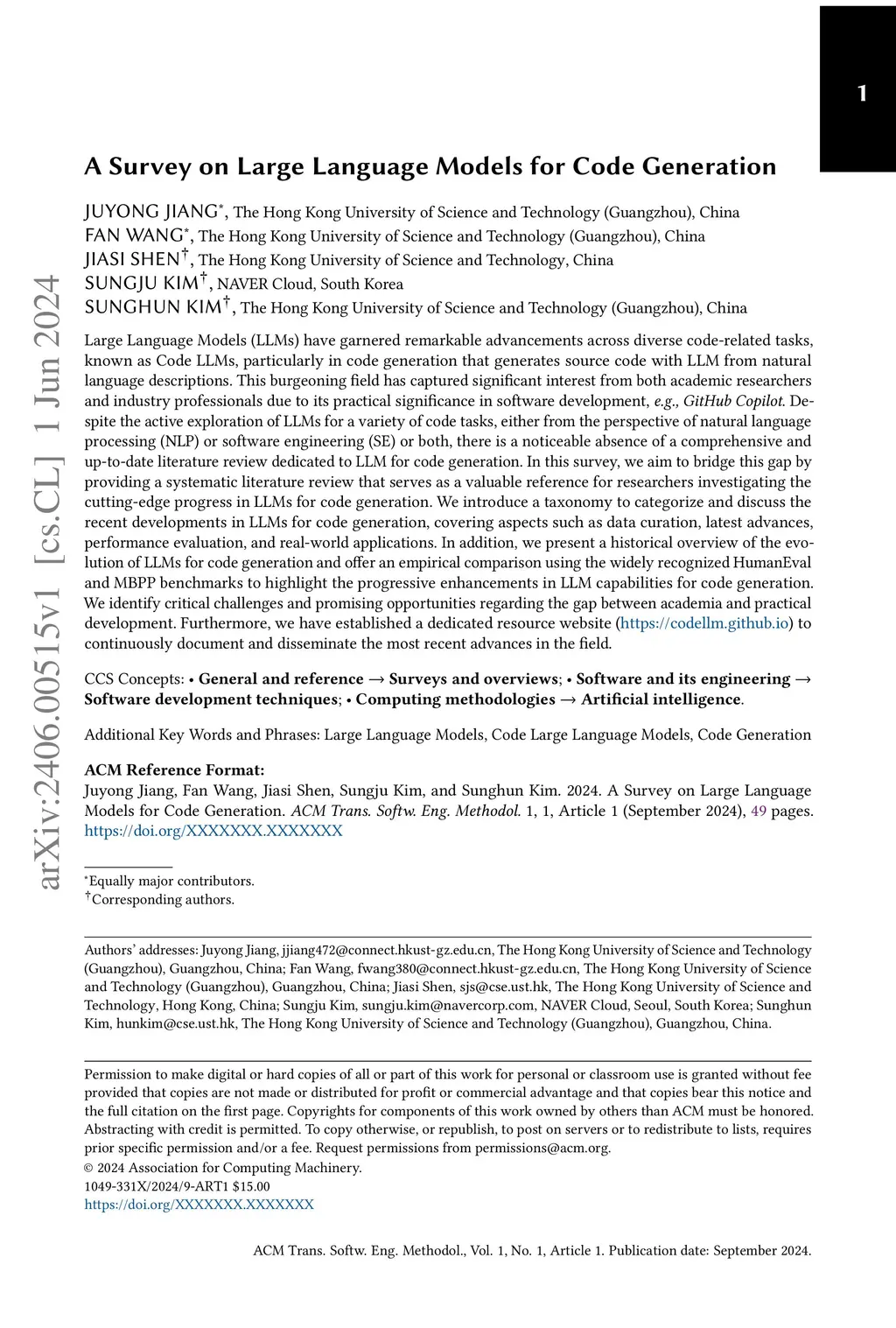 A Survey on Large Language Models for Code Generation