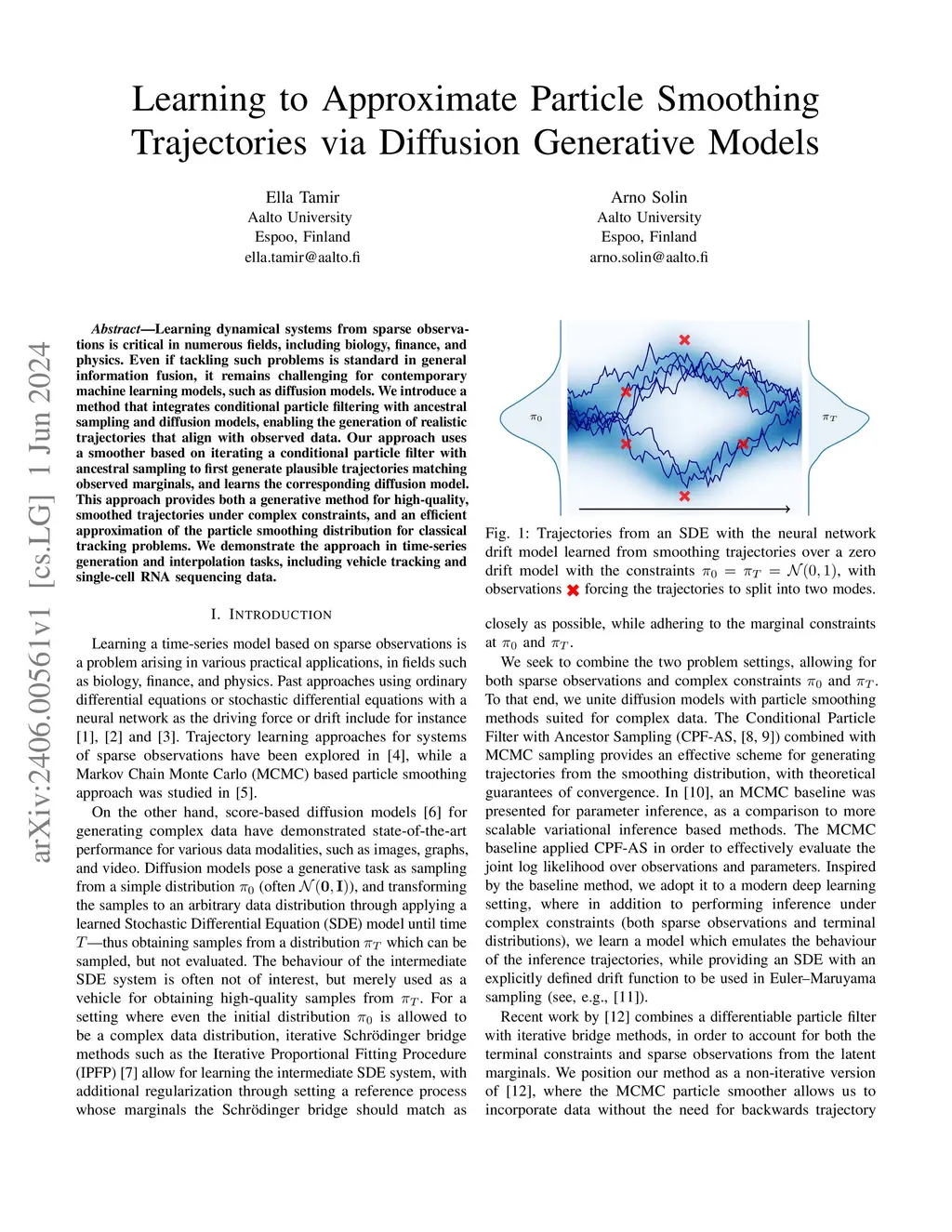 Learning dynamical systems from sparse observations is critical in numerous fields, including biology, finance, and physics. Even if tackling such problems is standard in general information fusion, it remains challenging for contemporary machine learning models, such as diffusion models. We introduce a method that integrates conditional particle filtering with ancestral sampling and diffusion models, enabling the generation of realistic trajectories that align with observed data. Our approach uses a smoother based on iterating a conditional particle filter with ancestral sampling to first generate plausible trajectories matching observed marginals, and learns the corresponding diffusion model. This approach provides both a generative method for high-quality, smoothed trajectories under complex constraints, and an efficient approximation of the particle smoothing distribution for classical tracking problems. We demonstrate the approach in time-series generation and interpolation tasks, including vehicle tracking and single-cell RNA sequencing data.