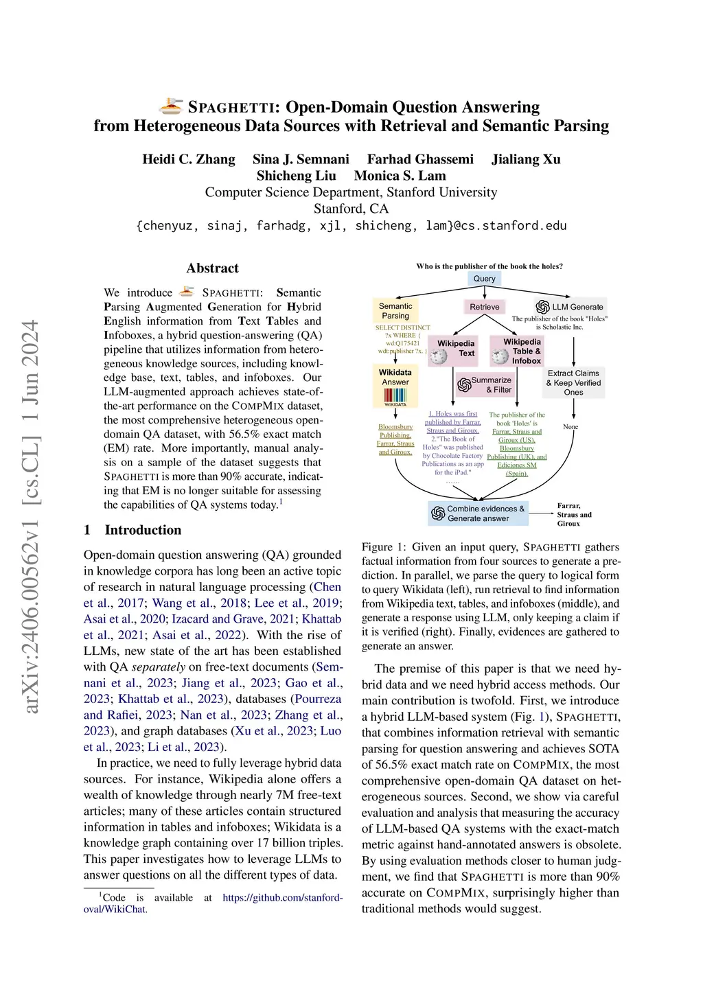We introduce SPAGHETTI: Semantic Parsing Augmented Generation for Hybrid English information from Text Tables and Infoboxes, a hybrid question-answering (QA) pipeline that utilizes information from heterogeneous knowledge sources, including knowledge base, text, tables, and infoboxes. Our LLM-augmented approach achieves state-of-the-art performance on the Compmix dataset, the most comprehensive heterogeneous open-domain QA dataset, with 56.5% exact match (EM) rate. More importantly, manual analysis on a sample of the dataset suggests that SPAGHETTI is more than 90% accurate, indicating that EM is no longer suitable for assessing the capabilities of QA systems today.