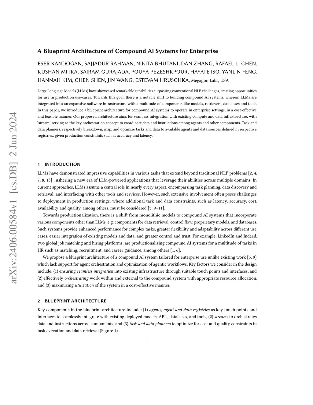 Large Language Models (LLMs) have showcased remarkable capabilities surpassing conventional NLP challenges, creating opportunities for use in production use cases. Towards this goal, there is a notable shift to building compound AI systems, wherein LLMs are integrated into an expansive software infrastructure with many components like models, retrievers, databases and tools. In this paper, we introduce a blueprint architecture for compound AI systems to operate in enterprise settings cost-effectively and feasibly. Our proposed architecture aims for seamless integration with existing compute and data infrastructure, with ``stream'' serving as the key orchestration concept to coordinate data and instructions among agents and other components. Task and data planners, respectively, break down, map, and optimize tasks and data to available agents and data sources defined in respective registries, given production constraints such as accuracy and latency.