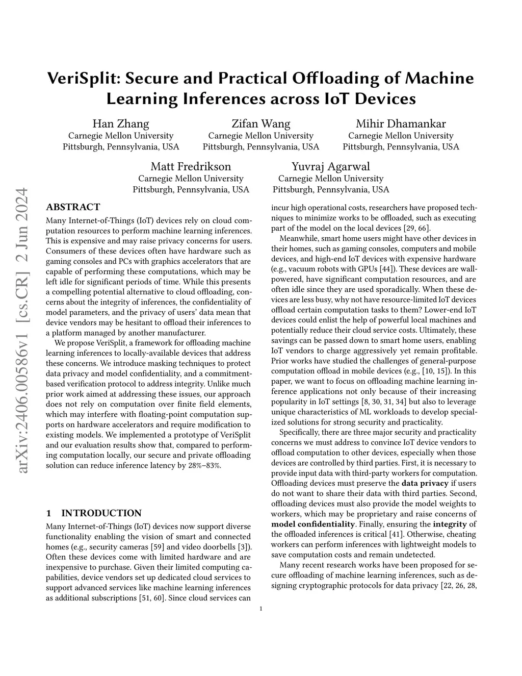 VeriSplit: Secure and Practical Offloading of Machine Learning Inferences across IoT Devices