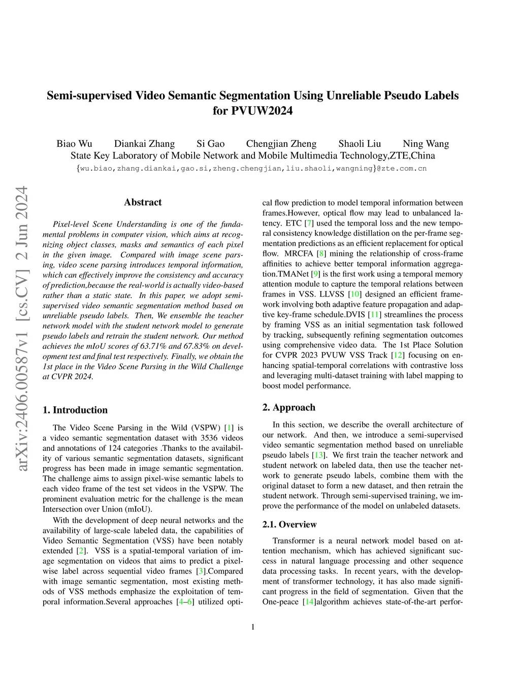 Pixel-level Scene Understanding is one of the fundamental problems in computer vision, which aims at recognizing object classes, masks and semantics of each pixel in the given image. Compared with image scene parsing, video scene parsing introduces temporal information, which can effectively improve the consistency and accuracy of prediction,because the real-world is actually video-based rather than a static state. In this paper, we adopt semi-supervised video semantic segmentation method based on unreliable pseudo labels. Then, We ensemble the teacher network model with the student network model to generate pseudo labels and retrain the student network. Our method achieves the mIoU scores of 63.71% and 67.83% on development test and final test respectively. Finally, we obtain the 1st place in the Video Scene Parsing in the Wild Challenge at CVPR 2024.