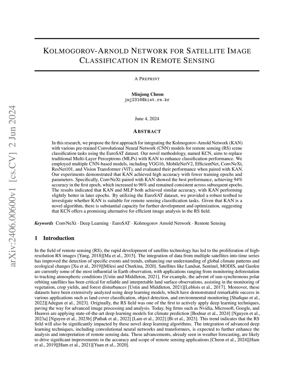 In this research, we propose the first approach for integrating the Kolmogorov-Arnold Network (KAN) with various pre-trained Convolutional Neural Network (CNN) models for remote sensing (RS) scene classification tasks using the EuroSAT dataset. Our novel methodology, named KCN, aims to replace traditional Multi-Layer Perceptrons (MLPs) with KAN to enhance classification performance. We employed multiple CNN-based models, including VGG16, MobileNetV2, EfficientNet, ConvNeXt, ResNet101, and Vision Transformer (ViT), and evaluated their performance when paired with KAN. Our experiments demonstrated that KAN achieved high accuracy with fewer training epochs and parameters. Specifically, ConvNeXt paired with KAN showed the best performance, achieving 94% accuracy in the first epoch, which increased to 96% and remained consistent across subsequent epochs. The results indicated that KAN and MLP both achieved similar accuracy, with KAN performing slightly better in later epochs. By utilizing the EuroSAT dataset, we provided a robust testbed to investigate whether KAN is suitable for remote sensing classification tasks. Given that KAN is a novel algorithm, there is substantial capacity for further development and optimization, suggesting that KCN offers a promising alternative for efficient image analysis in the RS field.