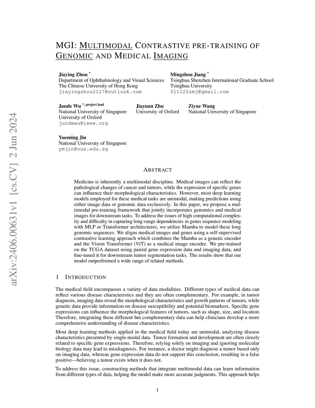 Medicine is inherently a multimodal discipline. Medical images can reflect the pathological changes of cancer and tumors, while the expression of specific genes can influence their morphological characteristics. However, most deep learning models employed for these medical tasks are unimodal, making predictions using either image data or genomic data exclusively. In this paper, we propose a multimodal pre-training framework that jointly incorporates genomics and medical images for downstream tasks. To address the issues of high computational complexity and difficulty in capturing long-range dependencies in genes sequence modeling with MLP or Transformer architectures, we utilize Mamba to model these long genomic sequences. We aligns medical images and genes using a self-supervised contrastive learning approach which combines the Mamba as a genetic encoder and the Vision Transformer (ViT) as a medical image encoder. We pre-trained on the TCGA dataset using paired gene expression data and imaging data, and fine-tuned it for downstream tumor segmentation tasks. The results show that our model outperformed a wide range of related methods.