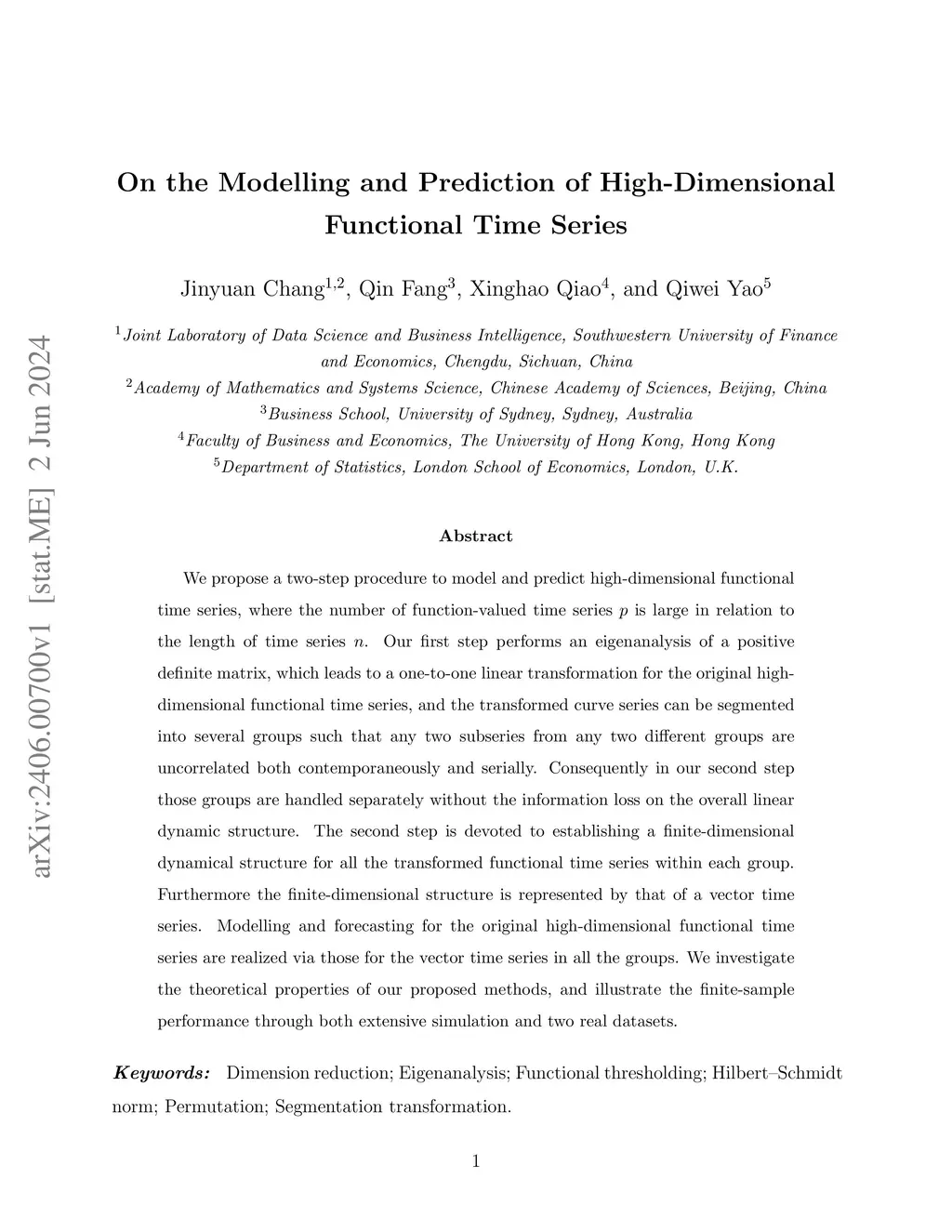 We propose a two-step procedure to model and predict high-dimensional functional time series, where the number of function-valued time series is large in relation to the length of time series . Our first step performs an eigenanalysis of a positive definite matrix, which leads to a one-to-one linear transformation for the original high-dimensional functional time series, and the transformed curve series can be segmented into several groups such that any two subseries from any two different groups are uncorrelated both contemporaneously and serially. Consequently in our second step those groups are handled separately without the information loss on the overall linear dynamic structure. The second step is devoted to establishing a finite-dimensional dynamical structure for all the transformed functional time series within each group. Furthermore the finite-dimensional structure is represented by that of a vector time series. Modelling and forecasting for the original high-dimensional functional time series are realized via those for the vector time series in all the groups. We investigate the theoretical properties of our proposed methods, and illustrate the finite-sample performance through both extensive simulation and two real datasets.