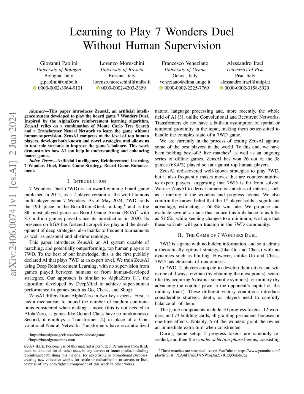 This paper introduces ZeusAI, an artificial intelligence system developed to play the board game 7 Wonders Duel. Inspired by the AlphaZero reinforcement learning algorithm, ZeusAI relies on a combination of Monte Carlo Tree Search and a Transformer Neural Network to learn the game without human supervision. ZeusAI competes at the level of top human players, develops both known and novel strategies, and allows us to test rule variants to improve the game's balance. This work demonstrates how AI can help in understanding and enhancing board games.