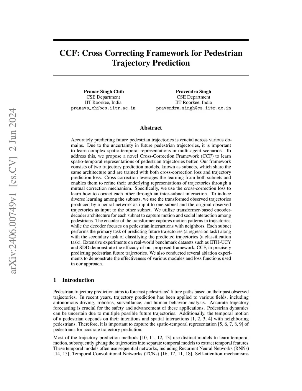 Accurately predicting future pedestrian trajectories is crucial across various domains. Due to the uncertainty in future pedestrian trajectories, it is important to learn complex spatio-temporal representations in multi-agent scenarios. To address this, we propose a novel Cross-Correction Framework (CCF) to learn spatio-temporal representations of pedestrian trajectories better. Our framework consists of two trajectory prediction models, known as subnets, which share the same architecture and are trained with both cross-correction loss and trajectory prediction loss. Cross-correction leverages the learning from both subnets and enables them to refine their underlying representations of trajectories through a mutual correction mechanism. Specifically, we use the cross-correction loss to learn how to correct each other through an inter-subnet interaction. To induce diverse learning among the subnets, we use the transformed observed trajectories produced by a neural network as input to one subnet and the original observed trajectories as input to the other subnet. We utilize transformer-based encoder-decoder architecture for each subnet to capture motion and social interaction among pedestrians. The encoder of the transformer captures motion patterns in trajectories, while the decoder focuses on pedestrian interactions with neighbors. Each subnet performs the primary task of predicting future trajectories (a regression task) along with the secondary task of classifying the predicted trajectories (a classification task). Extensive experiments on real-world benchmark datasets such as ETH-UCY and SDD demonstrate the efficacy of our proposed framework, CCF, in precisely predicting pedestrian future trajectories. We also conducted several ablation experiments to demonstrate the effectiveness of various modules and loss functions used in our approach.
