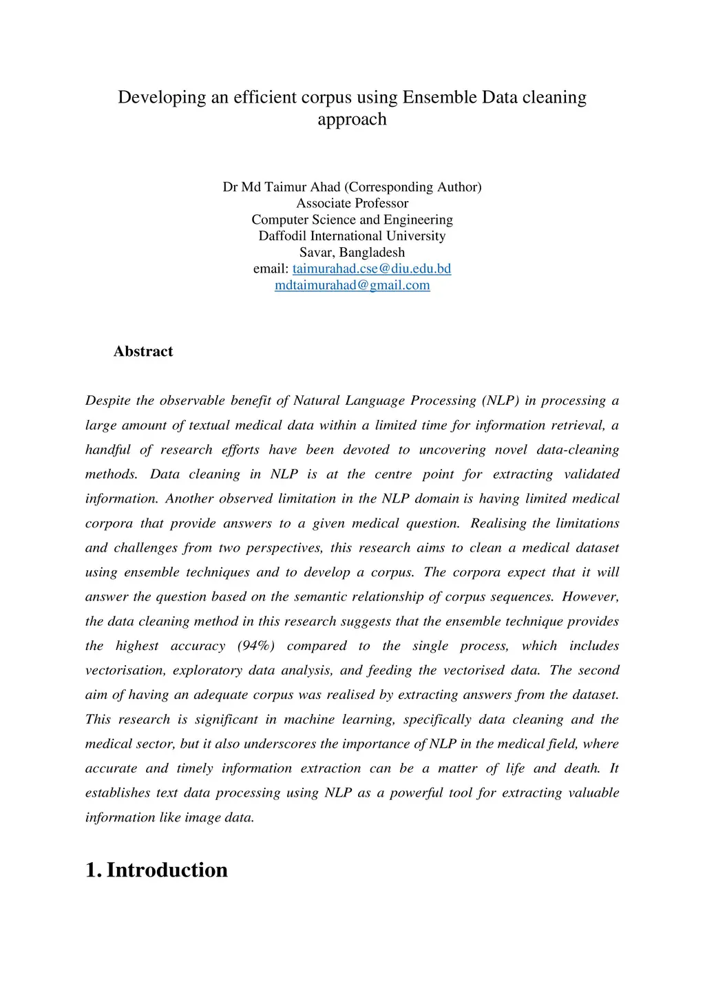 Despite the observable benefit of Natural Language Processing (NLP) in processing a large amount of textual medical data within a limited time for information retrieval, a handful of research efforts have been devoted to uncovering novel data-cleaning methods. Data cleaning in NLP is at the centre point for extracting validated information. Another observed limitation in the NLP domain is having limited medical corpora that provide answers to a given medical question. Realising the limitations and challenges from two perspectives, this research aims to clean a medical dataset using ensemble techniques and to develop a corpus. The corpora expect that it will answer the question based on the semantic relationship of corpus sequences. However, the data cleaning method in this research suggests that the ensemble technique provides the highest accuracy (94%) compared to the single process, which includes vectorisation, exploratory data analysis, and feeding the vectorised data. The second aim of having an adequate corpus was realised by extracting answers from the dataset. This research is significant in machine learning, specifically data cleaning and the medical sector, but it also underscores the importance of NLP in the medical field, where accurate and timely information extraction can be a matter of life and death. It establishes text data processing using NLP as a powerful tool for extracting valuable information like image data.