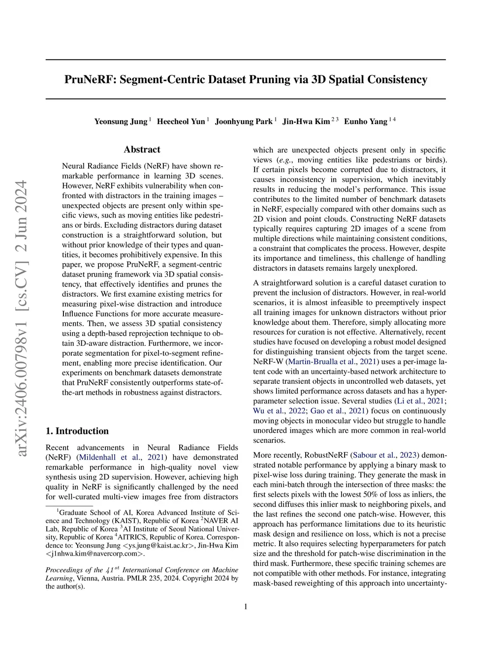Neural Radiance Fields (NeRF) have shown remarkable performance in learning 3D scenes. However, NeRF exhibits vulnerability when confronted with distractors in the training images -- unexpected objects are present only within specific views, such as moving entities like pedestrians or birds. Excluding distractors during dataset construction is a straightforward solution, but without prior knowledge of their types and quantities, it becomes prohibitively expensive. In this paper, we propose PruNeRF, a segment-centric dataset pruning framework via 3D spatial consistency, that effectively identifies and prunes the distractors. We first examine existing metrics for measuring pixel-wise distraction and introduce Influence Functions for more accurate measurements. Then, we assess 3D spatial consistency using a depth-based reprojection technique to obtain 3D-aware distraction. Furthermore, we incorporate segmentation for pixel-to-segment refinement, enabling more precise identification. Our experiments on benchmark datasets demonstrate that PruNeRF consistently outperforms state-of-the-art methods in robustness against distractors.