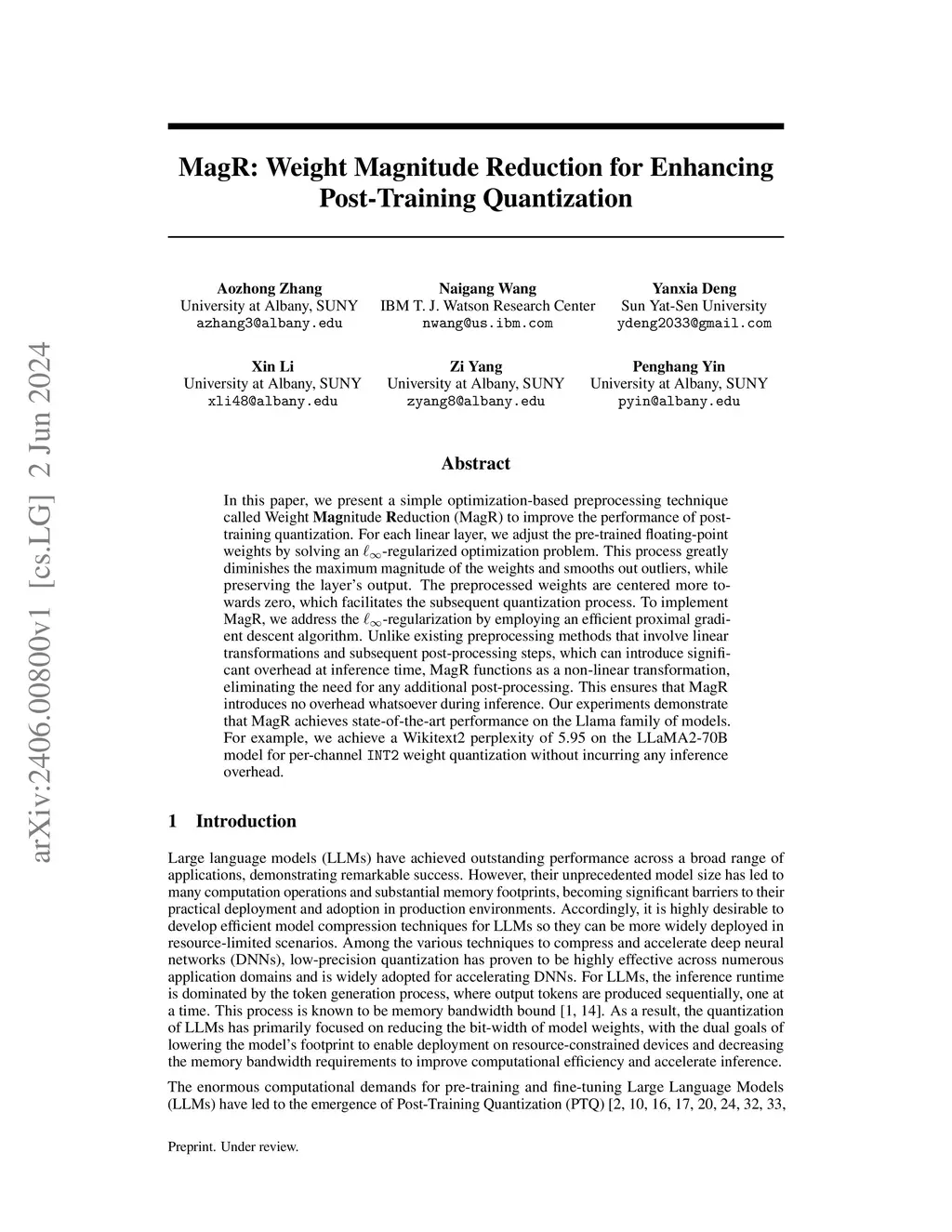 In this paper, we present a simple optimization-based preprocessing technique called Weight Magnitude Reduction (MagR) to improve the performance of post-training quantization. For each linear layer, we adjust the pre-trained floating-point weights by solving an -regularized optimization problem. This process greatly diminishes the maximum magnitude of the weights and smooths out outliers, while preserving the layer's output. The preprocessed weights are centered more towards zero, which facilitates the subsequent quantization process. To implement MagR, we address the -regularization by employing an efficient proximal gradient descent algorithm. Unlike existing preprocessing methods that involve linear transformations and subsequent post-processing steps, which can introduce significant overhead at inference time, MagR functions as a non-linear transformation, eliminating the need for any additional post-processing. This ensures that MagR introduces no overhead whatsoever during inference. Our experiments demonstrate that MagR achieves state-of-the-art performance on the Llama family of models. For example, we achieve a Wikitext2 perplexity of 5.95 on the LLaMA2-70B model for per-channel INT2 weight quantization without incurring any inference overhead.