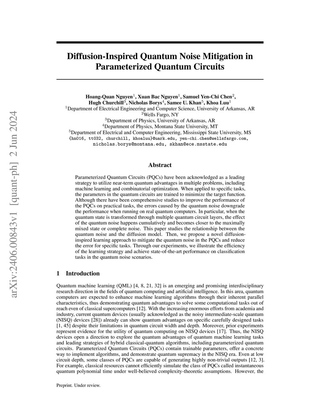 Parameterized Quantum Circuits (PQCs) have been acknowledged as a leading strategy to utilize near-term quantum advantages in multiple problems, including machine learning and combinatorial optimization. When applied to specific tasks, the parameters in the quantum circuits are trained to minimize the target function. Although there have been comprehensive studies to improve the performance of the PQCs on practical tasks, the errors caused by the quantum noise downgrade the performance when running on real quantum computers. In particular, when the quantum state is transformed through multiple quantum circuit layers, the effect of the quantum noise happens cumulatively and becomes closer to the maximally mixed state or complete noise. This paper studies the relationship between the quantum noise and the diffusion model. Then, we propose a novel diffusion-inspired learning approach to mitigate the quantum noise in the PQCs and reduce the error for specific tasks. Through our experiments, we illustrate the efficiency of the learning strategy and achieve state-of-the-art performance on classification tasks in the quantum noise scenarios.