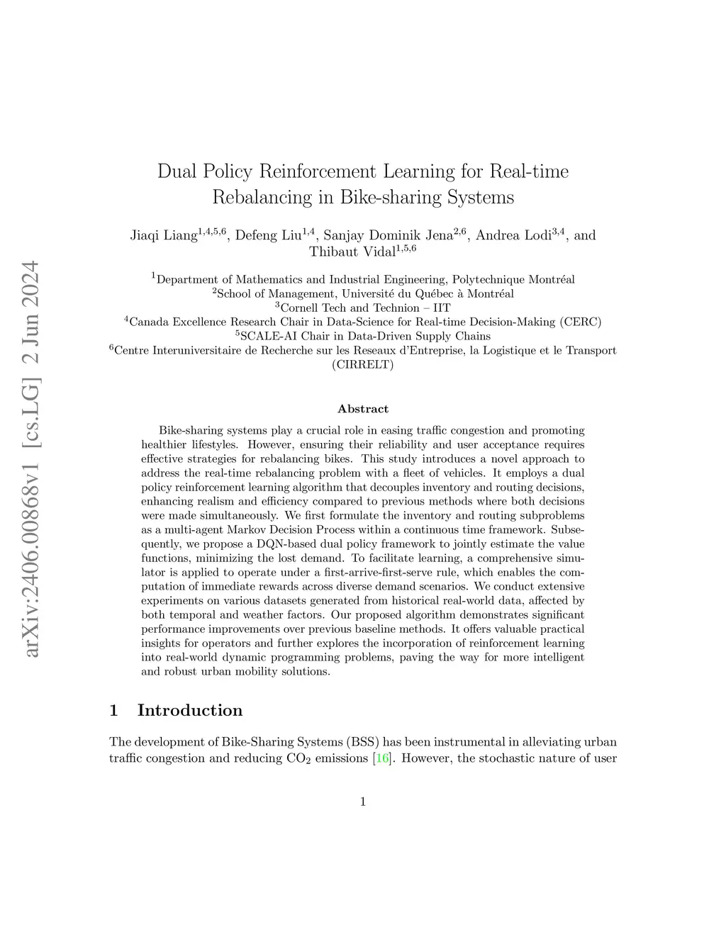 Bike-sharing systems play a crucial role in easing traffic congestion and promoting healthier lifestyles. However, ensuring their reliability and user acceptance requires effective strategies for rebalancing bikes. This study introduces a novel approach to address the real-time rebalancing problem with a fleet of vehicles. It employs a dual policy reinforcement learning algorithm that decouples inventory and routing decisions, enhancing realism and efficiency compared to previous methods where both decisions were made simultaneously. We first formulate the inventory and routing subproblems as a multi-agent Markov Decision Process within a continuous time framework. Subsequently, we propose a DQN-based dual policy framework to jointly estimate the value functions, minimizing the lost demand. To facilitate learning, a comprehensive simulator is applied to operate under a first-arrive-first-serve rule, which enables the computation of immediate rewards across diverse demand scenarios. We conduct extensive experiments on various datasets generated from historical real-world data, affected by both temporal and weather factors. Our proposed algorithm demonstrates significant performance improvements over previous baseline methods. It offers valuable practical insights for operators and further explores the incorporation of reinforcement learning into real-world dynamic programming problems, paving the way for more intelligent and robust urban mobility solutions.