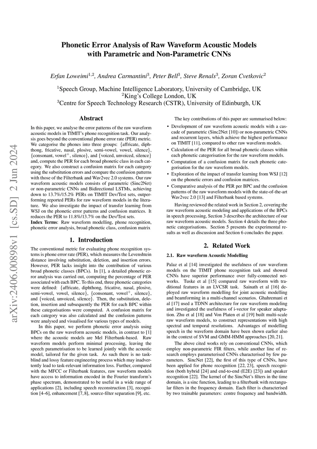 In this paper, we analyse the error patterns of the raw waveform acoustic models in TIMIT's phone recognition task. Our analysis goes beyond the conventional phone error rate (PER) metric. We categorise the phones into three groups: {affricate, diphthong, fricative, nasal, plosive, semi-vowel, vowel, silence}, {consonant, vowel+, silence}, and {voiced, unvoiced, silence} and, compute the PER for each broad phonetic class in each category. We also construct a confusion matrix for each category using the substitution errors and compare the confusion patterns with those of the Filterbank and Wav2vec 2.0 systems. Our raw waveform acoustic models consists of parametric (Sinc2Net) or non-parametric CNNs and Bidirectional LSTMs, achieving down to 13.7%/15.2% PERs on TIMIT Dev/Test sets, outperforming reported PERs for raw waveform models in the literature. We also investigate the impact of transfer learning from WSJ on the phonetic error patterns and confusion matrices. It reduces the PER to 11.8%/13.7% on the Dev/Test sets.