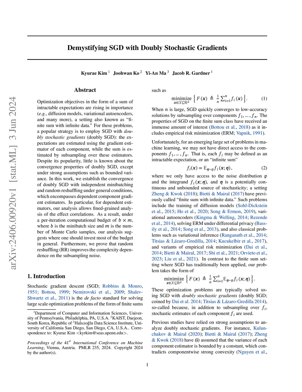 Optimization objectives in the form of a sum of intractable expectations are rising in importance (e.g., diffusion models, variational autoencoders, and many more), a setting also known as "finite sum with infinite data." For these problems, a popular strategy is to employ SGD with doubly stochastic gradients (doubly SGD): the expectations are estimated using the gradient estimator of each component, while the sum is estimated by subsampling over these estimators. Despite its popularity, little is known about the convergence properties of doubly SGD, except under strong assumptions such as bounded variance. In this work, we establish the convergence of doubly SGD with independent minibatching and random reshuffling under general conditions, which encompasses dependent component gradient estimators. In particular, for dependent estimators, our analysis allows fined-grained analysis of the effect correlations. As a result, under a per-iteration computational budget of , where is the minibatch size and is the number of Monte Carlo samples, our analysis suggests where one should invest most of the budget in general. Furthermore, we prove that random reshuffling (RR) improves the complexity dependence on the subsampling noise.