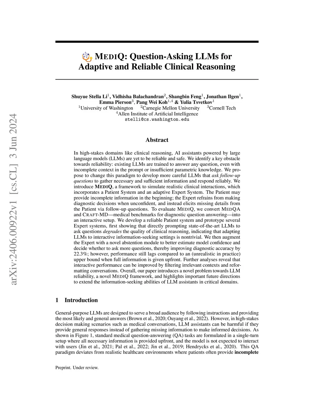 In high-stakes domains like clinical reasoning, AI assistants powered by large language models (LLMs) are yet to be reliable and safe. We identify a key obstacle towards reliability: existing LLMs are trained to answer any question, even with incomplete context in the prompt or insufficient parametric knowledge. We propose to change this paradigm to develop more careful LLMs that ask follow-up questions to gather necessary and sufficient information and respond reliably. We introduce MEDIQ, a framework to simulate realistic clinical interactions, which incorporates a Patient System and an adaptive Expert System. The Patient may provide incomplete information in the beginning; the Expert refrains from making diagnostic decisions when unconfident, and instead elicits missing details from the Patient via follow-up questions. To evaluate MEDIQ, we convert MEDQA and CRAFT-MD -- medical benchmarks for diagnostic question answering -- into an interactive setup. We develop a reliable Patient system and prototype several Expert systems, first showing that directly prompting state-of-the-art LLMs to ask questions degrades the quality of clinical reasoning, indicating that adapting LLMs to interactive information-seeking settings is nontrivial. We then augment the Expert with a novel abstention module to better estimate model confidence and decide whether to ask more questions, thereby improving diagnostic accuracy by 20.3%; however, performance still lags compared to an (unrealistic in practice) upper bound when full information is given upfront. Further analyses reveal that interactive performance can be improved by filtering irrelevant contexts and reformatting conversations. Overall, our paper introduces a novel problem towards LLM reliability, a novel MEDIQ framework, and highlights important future directions to extend the information-seeking abilities of LLM assistants in critical domains.