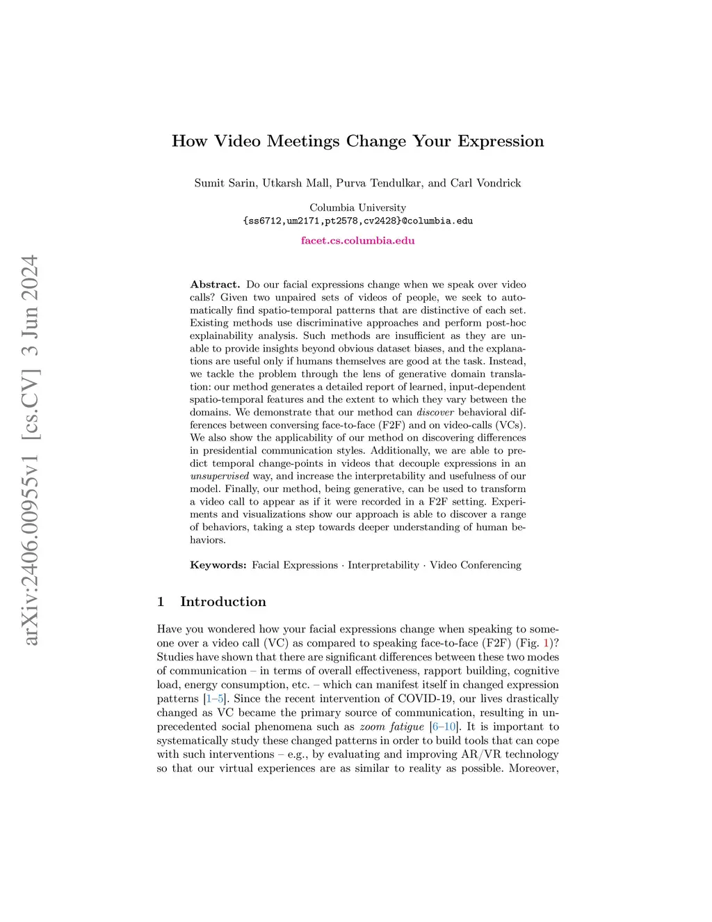 Do our facial expressions change when we speak over video calls? Given two unpaired sets of videos of people, we seek to automatically find spatio-temporal patterns that are distinctive of each set. Existing methods use discriminative approaches and perform post-hoc explainability analysis. Such methods are insufficient as they are unable to provide insights beyond obvious dataset biases, and the explanations are useful only if humans themselves are good at the task. Instead, we tackle the problem through the lens of generative domain translation: our method generates a detailed report of learned, input-dependent spatio-temporal features and the extent to which they vary between the domains. We demonstrate that our method can discover behavioral differences between conversing face-to-face (F2F) and on video-calls (VCs). We also show the applicability of our method on discovering differences in presidential communication styles. Additionally, we are able to predict temporal change-points in videos that decouple expressions in an unsupervised way, and increase the interpretability and usefulness of our model. Finally, our method, being generative, can be used to transform a video call to appear as if it were recorded in a F2F setting. Experiments and visualizations show our approach is able to discover a range of behaviors, taking a step towards deeper understanding of human behaviors.