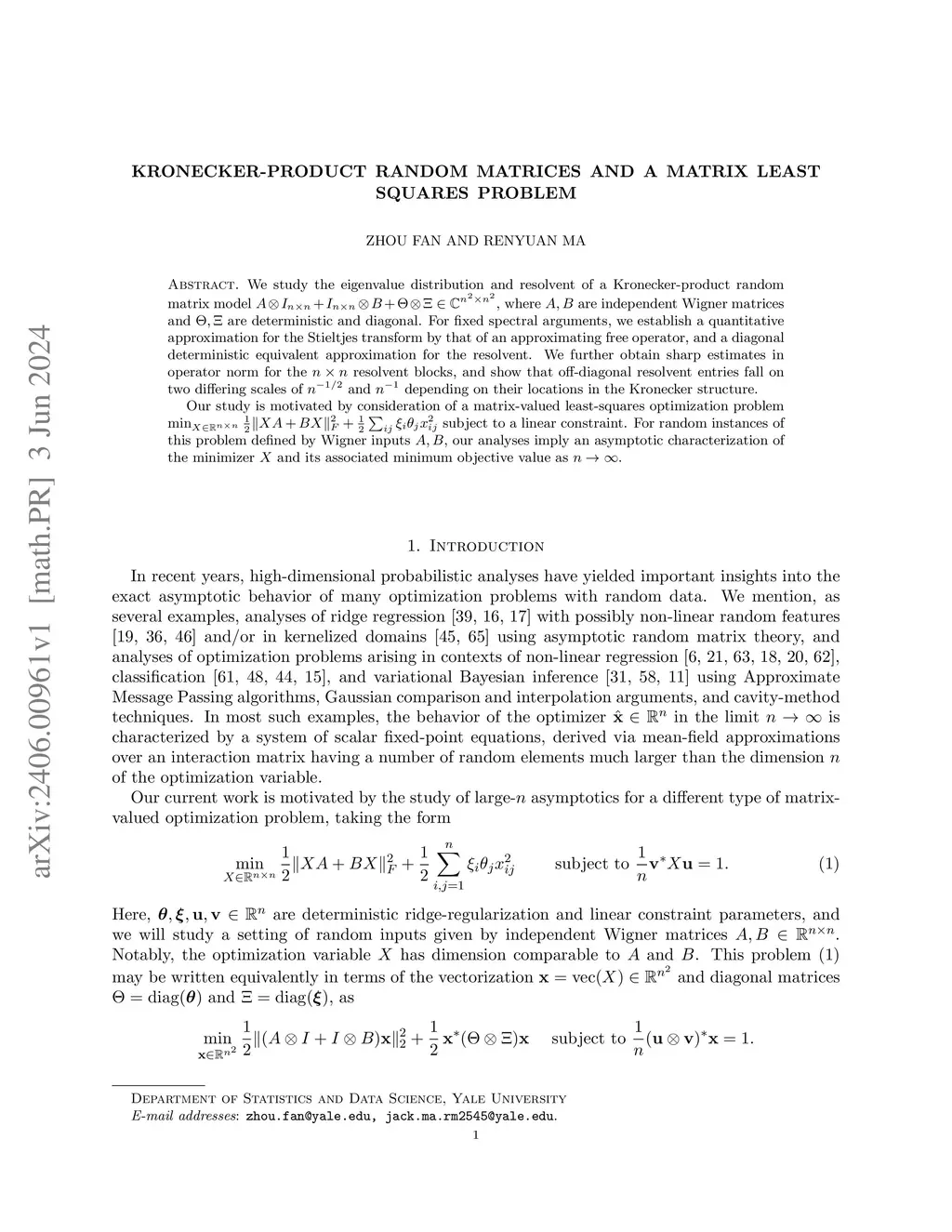 Kronecker-product random matrices and a matrix least squares problem