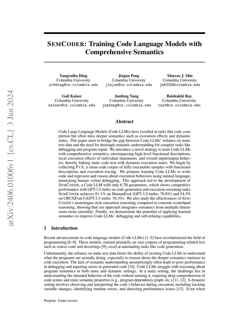 Code Large Language Models (Code LLMs) have excelled at tasks like code completion but often miss deeper semantics such as execution effects and dynamic states. This paper aims to bridge the gap between Code LLMs' reliance on static text data and the need for thorough semantic understanding for complex tasks like debugging and program repair. We introduce a novel strategy to train Code LLMs with comprehensive semantics, encompassing high-level functional descriptions, local execution effects of individual statements, and overall input/output behavior, thereby linking static code text with dynamic execution states. We begin by collecting PyX, a clean code corpus of fully executable samples with functional descriptions and execution tracing. We propose training Code LLMs to write code and represent and reason about execution behaviors using natural language, mimicking human verbal debugging. This approach led to the development of SemCoder, a Code LLM with only 6.7B parameters, which shows competitive performance with GPT-3.5-turbo on code generation and execution reasoning tasks. SemCoder achieves 81.1% on HumanEval (GPT-3.5-turbo: 76.8%) and 54.5% on CRUXEval-I (GPT-3.5-turbo: 50.3%). We also study the effectiveness of SemCoder's monologue-style execution reasoning compared to concrete scratchpad reasoning, showing that our approach integrates semantics from multiple dimensions more smoothly. Finally, we demonstrate the potential of applying learned semantics to improve Code LLMs' debugging and self-refining capabilities.