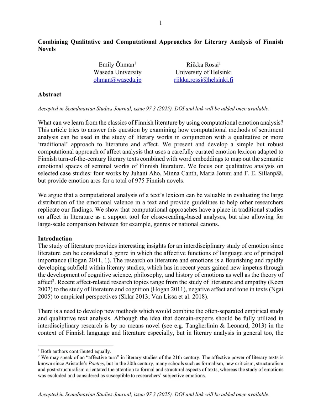 What can we learn from the classics of Finnish literature by using computational emotion analysis? This article tries to answer this question by examining how computational methods of sentiment analysis can be used in the study of literary works in conjunction with a qualitative or more 'traditional' approach to literature and affect. We present and develop a simple but robust computational approach of affect analysis that uses a carefully curated emotion lexicon adapted to Finnish turn-of-the-century literary texts combined with word embeddings to map out the semantic emotional spaces of seminal works of Finnish literature. We focus our qualitative analysis on selected case studies: four works by Juhani Aho, Minna Canth, Maria Jotuni, and F. E. Sillanp\"a\"a, but provide emotion arcs for a total of 975 Finnish novels. We argue that a computational analysis of a text's lexicon can be valuable in evaluating the large distribution of the emotional valence in a text and provide guidelines to help other researchers replicate our findings. We show that computational approaches have a place in traditional studies on affect in literature as a support tool for close-reading-based analyses, but also allowing for large-scale comparison between, for example, genres or national canons.