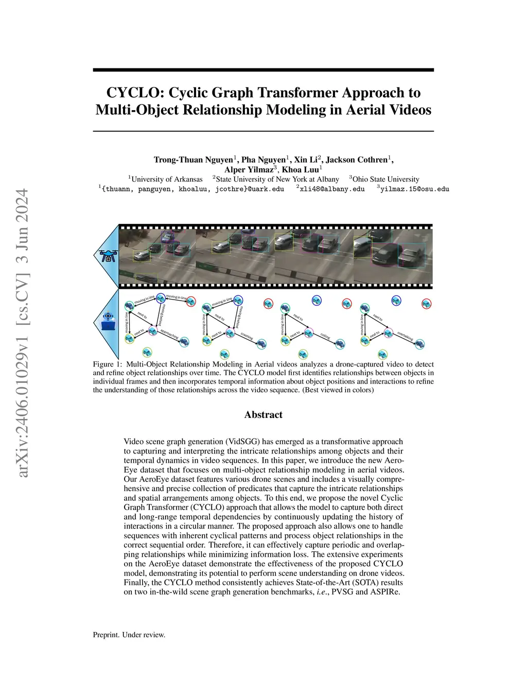Video scene graph generation (VidSGG) has emerged as a transformative approach to capturing and interpreting the intricate relationships among objects and their temporal dynamics in video sequences. In this paper, we introduce the new AeroEye dataset that focuses on multi-object relationship modeling in aerial videos. Our AeroEye dataset features various drone scenes and includes a visually comprehensive and precise collection of predicates that capture the intricate relationships and spatial arrangements among objects. To this end, we propose the novel Cyclic Graph Transformer (CYCLO) approach that allows the model to capture both direct and long-range temporal dependencies by continuously updating the history of interactions in a circular manner. The proposed approach also allows one to handle sequences with inherent cyclical patterns and process object relationships in the correct sequential order. Therefore, it can effectively capture periodic and overlapping relationships while minimizing information loss. The extensive experiments on the AeroEye dataset demonstrate the effectiveness of the proposed CYCLO model, demonstrating its potential to perform scene understanding on drone videos. Finally, the CYCLO method consistently achieves State-of-the-Art (SOTA) results on two in-the-wild scene graph generation benchmarks, i.e., PVSG and ASPIRe.
