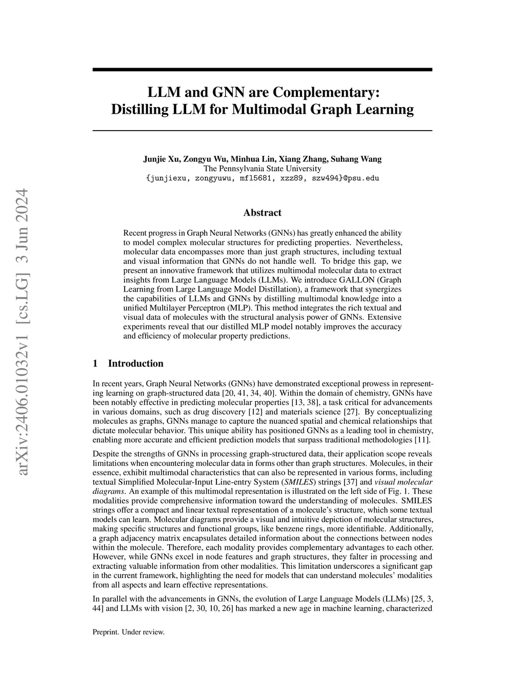Recent progress in Graph Neural Networks (GNNs) has greatly enhanced the ability to model complex molecular structures for predicting properties. Nevertheless, molecular data encompasses more than just graph structures, including textual and visual information that GNNs do not handle well. To bridge this gap, we present an innovative framework that utilizes multimodal molecular data to extract insights from Large Language Models (LLMs). We introduce GALLON (Graph Learning from Large Language Model Distillation), a framework that synergizes the capabilities of LLMs and GNNs by distilling multimodal knowledge into a unified Multilayer Perceptron (MLP). This method integrates the rich textual and visual data of molecules with the structural analysis power of GNNs. Extensive experiments reveal that our distilled MLP model notably improves the accuracy and efficiency of molecular property predictions.