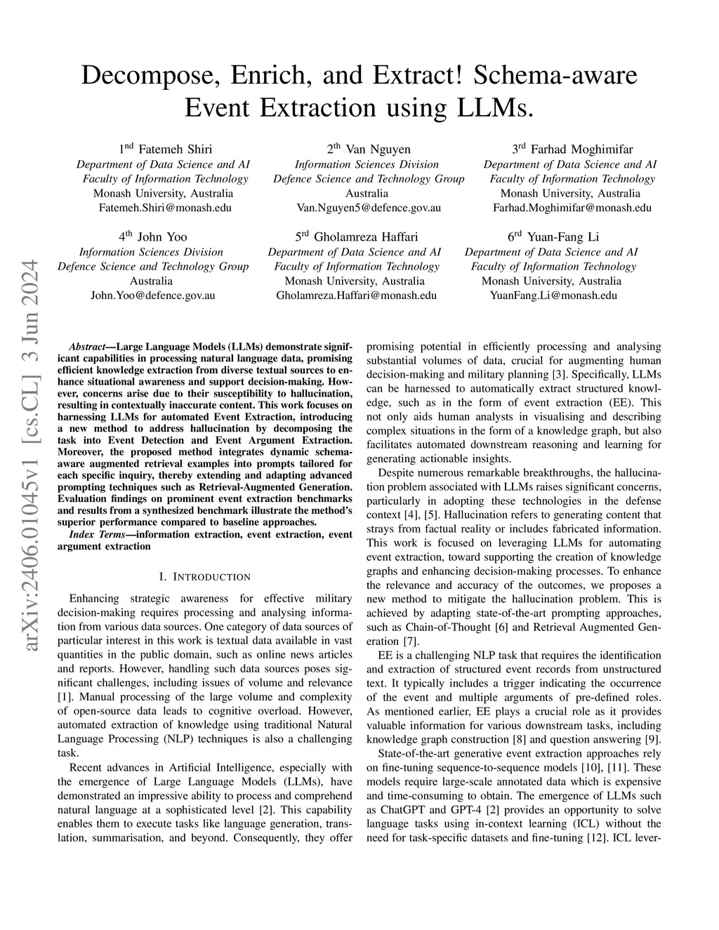 Large Language Models (LLMs) demonstrate significant capabilities in processing natural language data, promising efficient knowledge extraction from diverse textual sources to enhance situational awareness and support decision-making. However, concerns arise due to their susceptibility to hallucination, resulting in contextually inaccurate content. This work focuses on harnessing LLMs for automated Event Extraction, introducing a new method to address hallucination by decomposing the task into Event Detection and Event Argument Extraction. Moreover, the proposed method integrates dynamic schema-aware augmented retrieval examples into prompts tailored for each specific inquiry, thereby extending and adapting advanced prompting techniques such as Retrieval-Augmented Generation. Evaluation findings on prominent event extraction benchmarks and results from a synthesized benchmark illustrate the method's superior performance compared to baseline approaches.