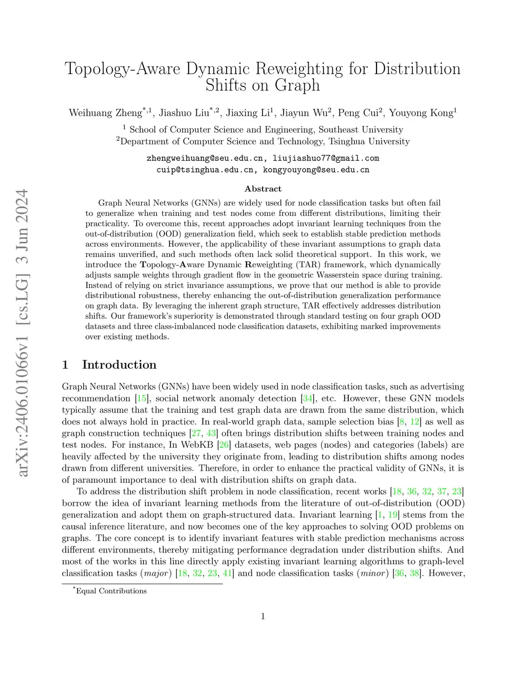 Graph Neural Networks (GNNs) are widely used for node classification tasks but often fail to generalize when training and test nodes come from different distributions, limiting their practicality. To overcome this, recent approaches adopt invariant learning techniques from the out-of-distribution (OOD) generalization field, which seek to establish stable prediction methods across environments. However, the applicability of these invariant assumptions to graph data remains unverified, and such methods often lack solid theoretical support. In this work, we introduce the Topology-Aware Dynamic Reweighting (TAR) framework, which dynamically adjusts sample weights through gradient flow in the geometric Wasserstein space during training. Instead of relying on strict invariance assumptions, we prove that our method is able to provide distributional robustness, thereby enhancing the out-of-distribution generalization performance on graph data. By leveraging the inherent graph structure, TAR effectively addresses distribution shifts. Our framework's superiority is demonstrated through standard testing on four graph OOD datasets and three class-imbalanced node classification datasets, exhibiting marked improvements over existing methods.