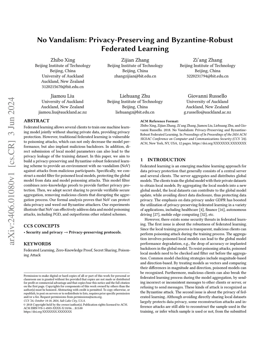 Federated learning allows several clients to train one machine learning model jointly without sharing private data, providing privacy protection. However, traditional federated learning is vulnerable to poisoning attacks, which can not only decrease the model performance, but also implant malicious backdoors. In addition, direct submission of local model parameters can also lead to the privacy leakage of the training dataset. In this paper, we aim to build a privacy-preserving and Byzantine-robust federated learning scheme to provide an environment with no vandalism (NoV) against attacks from malicious participants. Specifically, we construct a model filter for poisoned local models, protecting the global model from data and model poisoning attacks. This model filter combines zero-knowledge proofs to provide further privacy protection. Then, we adopt secret sharing to provide verifiable secure aggregation, removing malicious clients that disrupting the aggregation process. Our formal analysis proves that NoV can protect data privacy and weed out Byzantine attackers. Our experiments illustrate that NoV can effectively address data and model poisoning attacks, including PGD, and outperforms other related schemes.