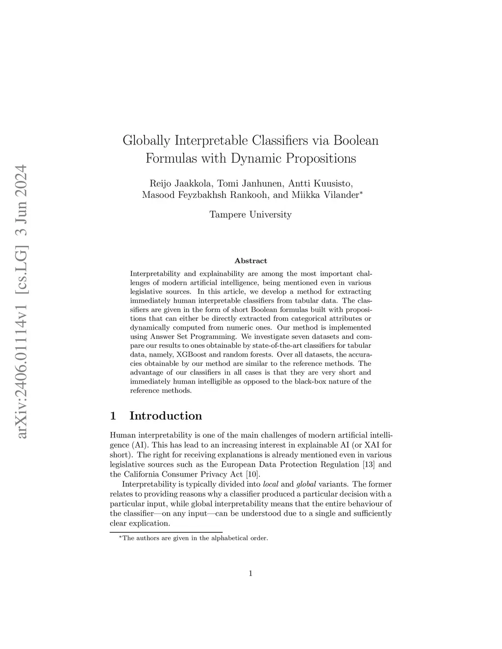 Interpretability and explainability are among the most important challenges of modern artificial intelligence, being mentioned even in various legislative sources. In this article, we develop a method for extracting immediately human interpretable classifiers from tabular data. The classifiers are given in the form of short Boolean formulas built with propositions that can either be directly extracted from categorical attributes or dynamically computed from numeric ones. Our method is implemented using Answer Set Programming. We investigate seven datasets and compare our results to ones obtainable by state-of-the-art classifiers for tabular data, namely, XGBoost and random forests. Over all datasets, the accuracies obtainable by our method are similar to the reference methods. The advantage of our classifiers in all cases is that they are very short and immediately human intelligible as opposed to the black-box nature of the reference methods.