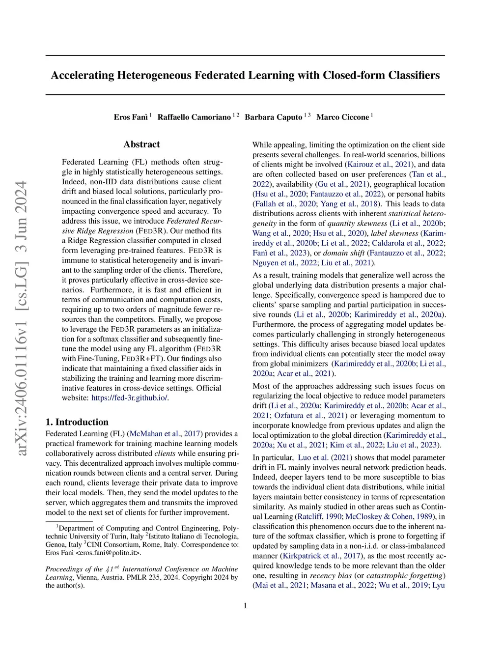 Federated Learning (FL) methods often struggle in highly statistically heterogeneous settings. Indeed, non-IID data distributions cause client drift and biased local solutions, particularly pronounced in the final classification layer, negatively impacting convergence speed and accuracy. To address this issue, we introduce Federated Recursive Ridge Regression (Fed3R). Our method fits a Ridge Regression classifier computed in closed form leveraging pre-trained features. Fed3R is immune to statistical heterogeneity and is invariant to the sampling order of the clients. Therefore, it proves particularly effective in cross-device scenarios. Furthermore, it is fast and efficient in terms of communication and computation costs, requiring up to two orders of magnitude fewer resources than the competitors. Finally, we propose to leverage the Fed3R parameters as an initialization for a softmax classifier and subsequently fine-tune the model using any FL algorithm (Fed3R with Fine-Tuning, Fed3R+FT). Our findings also indicate that maintaining a fixed classifier aids in stabilizing the training and learning more discriminative features in cross-device settings. Official website: https://fed-3r.github.io/.