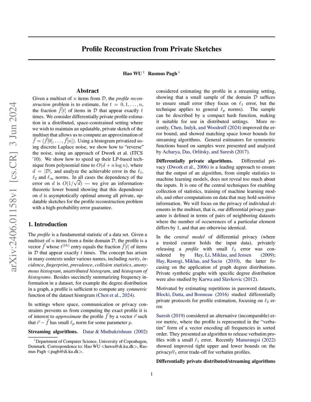 Given a multiset of items from , the \emph{profile reconstruction} problem is to estimate, for , the fraction of items in that appear exactly times. We consider differentially private profile estimation in a distributed, space-constrained setting where we wish to maintain an updatable, private sketch of the multiset that allows us to compute an approximation of . Using a histogram privatized using discrete Laplace noise, we show how to ``reverse'' the noise, using an approach of Dwork et al.~(ITCS '10). We show how to speed up their LP-based technique from polynomial time to , where , and analyze the achievable error in the , and norms. In all cases the dependency of the error on is -- we give an information-theoretic lower bound showing that this dependence on is asymptotically optimal among all private, updatable sketches for the profile reconstruction problem with a high-probability error guarantee.