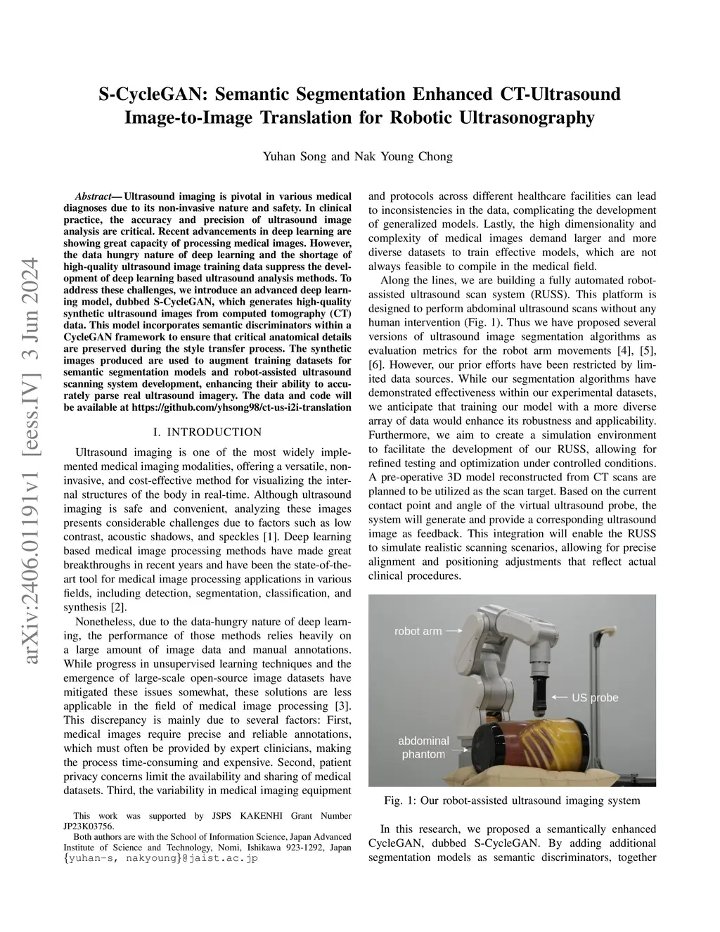 Ultrasound imaging is pivotal in various medical diagnoses due to its non-invasive nature and safety. In clinical practice, the accuracy and precision of ultrasound image analysis are critical. Recent advancements in deep learning are showing great capacity of processing medical images. However, the data hungry nature of deep learning and the shortage of high-quality ultrasound image training data suppress the development of deep learning based ultrasound analysis methods. To address these challenges, we introduce an advanced deep learning model, dubbed S-CycleGAN, which generates high-quality synthetic ultrasound images from computed tomography (CT) data. This model incorporates semantic discriminators within a CycleGAN framework to ensure that critical anatomical details are preserved during the style transfer process. The synthetic images are utilized to enhance various aspects of our development of the robot-assisted ultrasound scanning system. The data and code will be available at https://github.com/yhsong98/ct-us-i2i-translation.