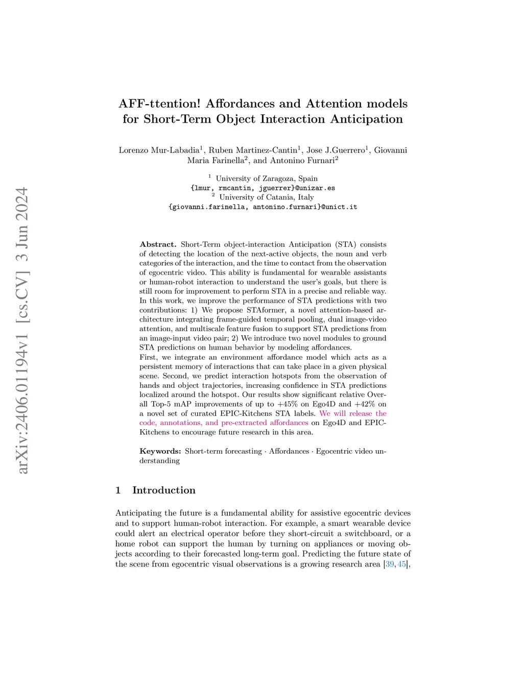 Short-Term object-interaction Anticipation consists of detecting the location of the next-active objects, the noun and verb categories of the interaction, and the time to contact from the observation of egocentric video. This ability is fundamental for wearable assistants or human robot interaction to understand the user goals, but there is still room for improvement to perform STA in a precise and reliable way. In this work, we improve the performance of STA predictions with two contributions: 1. We propose STAformer, a novel attention-based architecture integrating frame guided temporal pooling, dual image-video attention, and multiscale feature fusion to support STA predictions from an image-input video pair. 2. We introduce two novel modules to ground STA predictions on human behavior by modeling affordances.First, we integrate an environment affordance model which acts as a persistent memory of interactions that can take place in a given physical scene. Second, we predict interaction hotspots from the observation of hands and object trajectories, increasing confidence in STA predictions localized around the hotspot. Our results show significant relative Overall Top-5 mAP improvements of up to +45% on Ego4D and +42% on a novel set of curated EPIC-Kitchens STA labels. We will release the code, annotations, and pre extracted affordances on Ego4D and EPIC- Kitchens to encourage future research in this area.