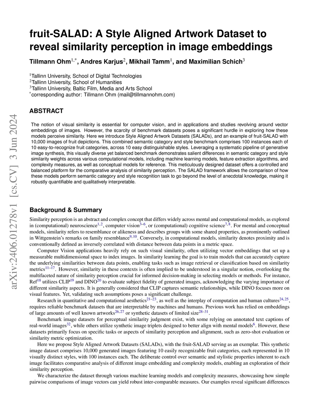 The notion of visual similarity is essential for computer vision, and in applications and studies revolving around vector embeddings of images. However, the scarcity of benchmark datasets poses a significant hurdle in exploring how these models perceive similarity. Here we introduce Style Aligned Artwork Datasets (SALADs), and an example of fruit-SALAD with 10,000 images of fruit depictions. This combined semantic category and style benchmark comprises 100 instances each of 10 easy-to-recognize fruit categories, across 10 easy distinguishable styles. Leveraging a systematic pipeline of generative image synthesis, this visually diverse yet balanced benchmark demonstrates salient differences in semantic category and style similarity weights across various computational models, including machine learning models, feature extraction algorithms, and complexity measures, as well as conceptual models for reference. This meticulously designed dataset offers a controlled and balanced platform for the comparative analysis of similarity perception. The SALAD framework allows the comparison of how these models perform semantic category and style recognition task to go beyond the level of anecdotal knowledge, making it robustly quantifiable and qualitatively interpretable.