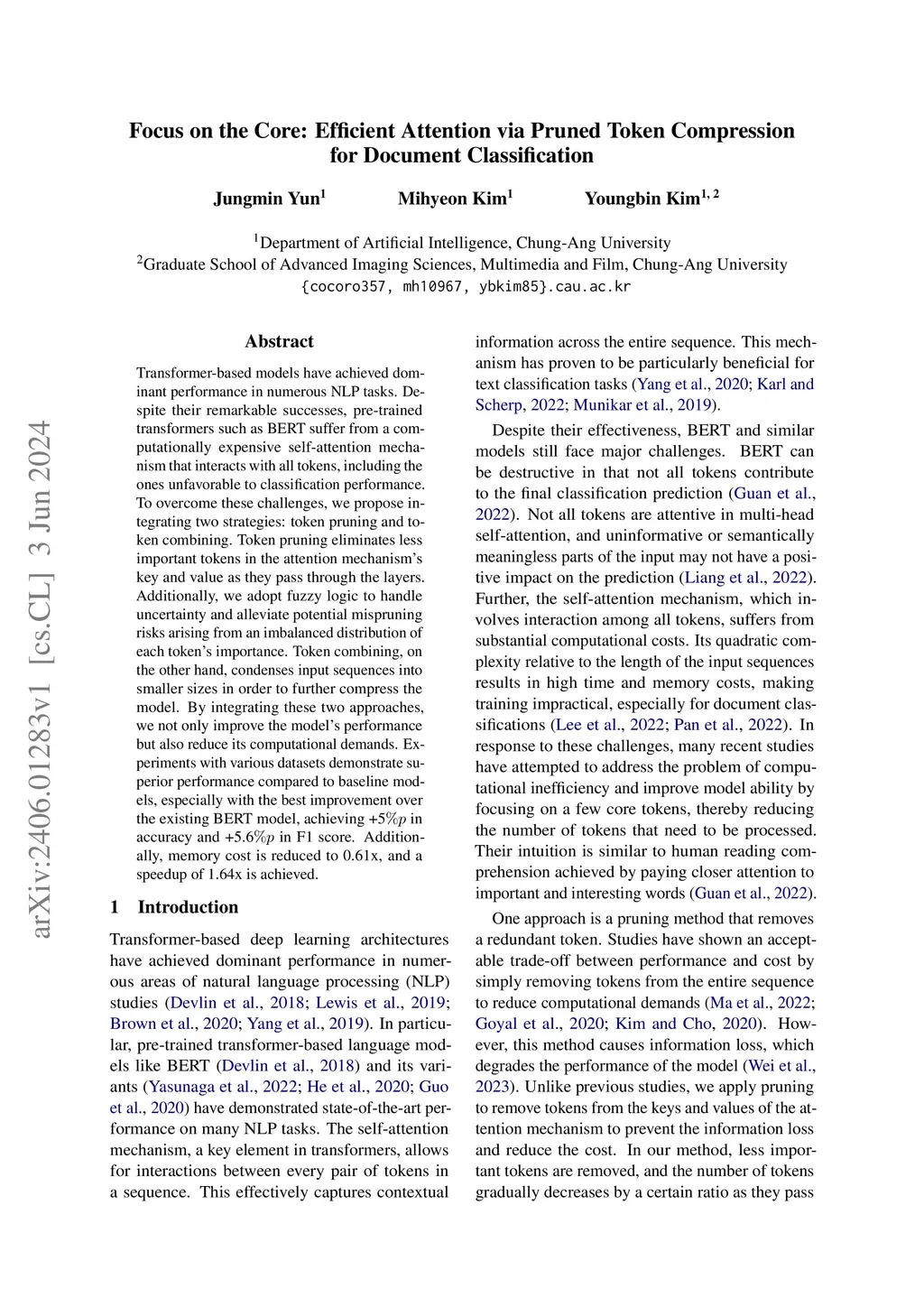 Transformer-based models have achieved dominant performance in numerous NLP tasks. Despite their remarkable successes, pre-trained transformers such as BERT suffer from a computationally expensive self-attention mechanism that interacts with all tokens, including the ones unfavorable to classification performance. To overcome these challenges, we propose integrating two strategies: token pruning and token combining. Token pruning eliminates less important tokens in the attention mechanism's key and value as they pass through the layers. Additionally, we adopt fuzzy logic to handle uncertainty and alleviate potential mispruning risks arising from an imbalanced distribution of each token's importance. Token combining, on the other hand, condenses input sequences into smaller sizes in order to further compress the model. By integrating these two approaches, we not only improve the model's performance but also reduce its computational demands. Experiments with various datasets demonstrate superior performance compared to baseline models, especially with the best improvement over the existing BERT model, achieving +5%p in accuracy and +5.6%p in F1 score. Additionally, memory cost is reduced to 0.61x, and a speedup of 1.64x is achieved.