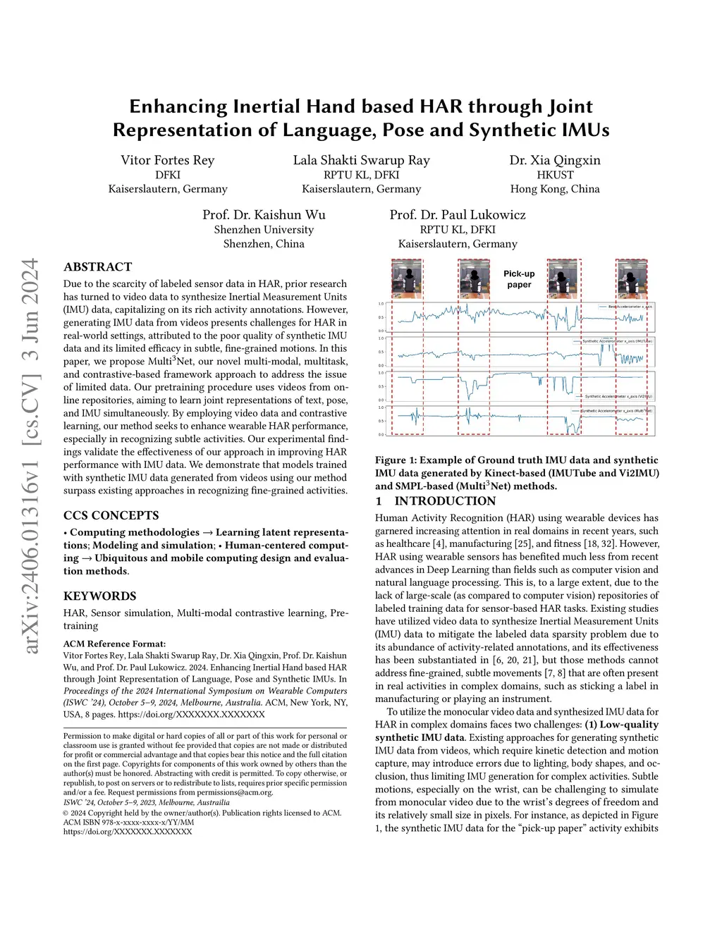 Due to the scarcity of labeled sensor data in HAR, prior research has turned to video data to synthesize Inertial Measurement Units (IMU) data, capitalizing on its rich activity annotations. However, generating IMU data from videos presents challenges for HAR in real-world settings, attributed to the poor quality of synthetic IMU data and its limited efficacy in subtle, fine-grained motions. In this paper, we propose MultiNet, our novel multi-modal, multitask, and contrastive-based framework approach to address the issue of limited data. Our pretraining procedure uses videos from online repositories, aiming to learn joint representations of text, pose, and IMU simultaneously. By employing video data and contrastive learning, our method seeks to enhance wearable HAR performance, especially in recognizing subtle activities.Our experimental findings validate the effectiveness of our approach in improving HAR performance with IMU data. We demonstrate that models trained with synthetic IMU data generated from videos using our method surpass existing approaches in recognizing fine-grained activities.