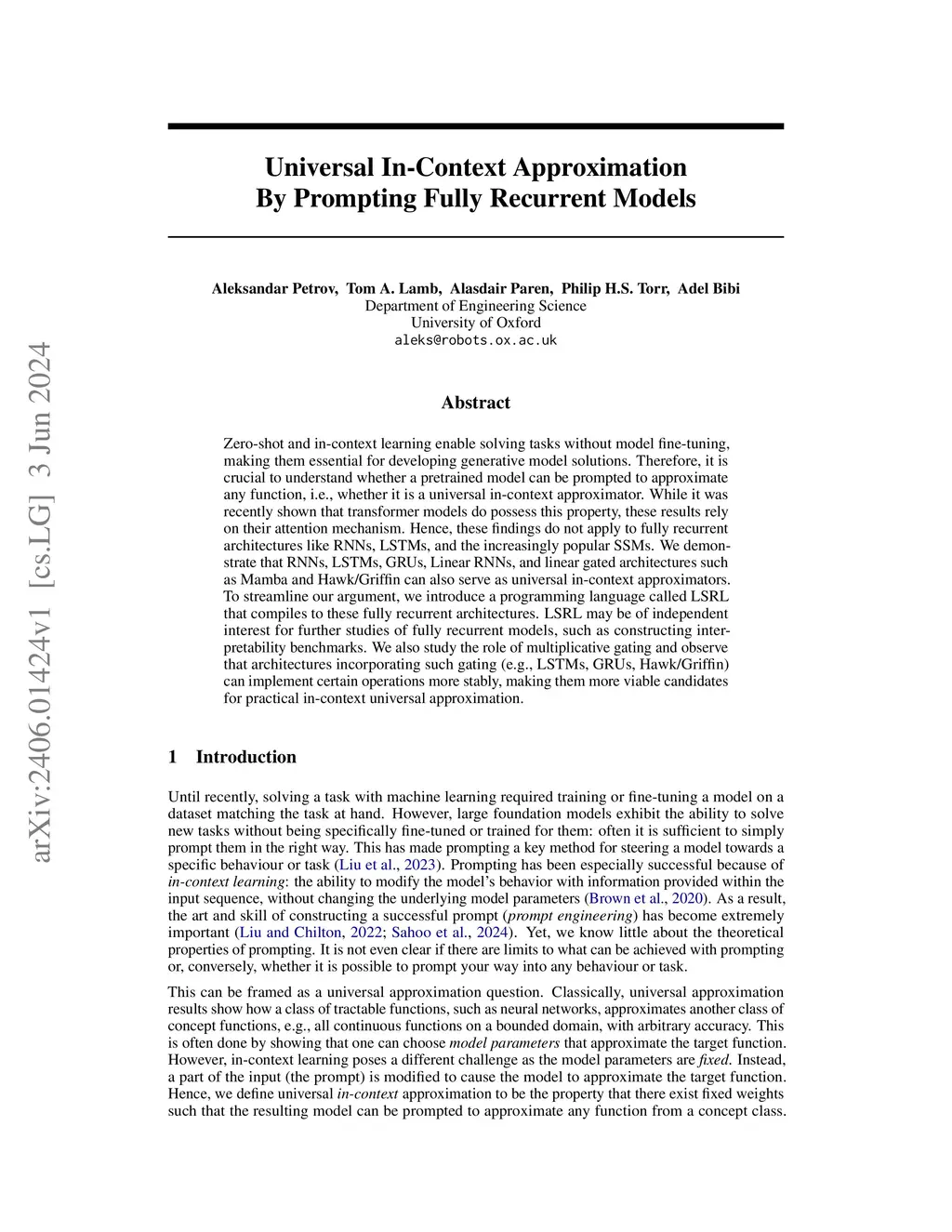 Zero-shot and in-context learning enable solving tasks without model fine-tuning, making them essential for developing generative model solutions. Therefore, it is crucial to understand whether a pretrained model can be prompted to approximate any function, i.e., whether it is a universal in-context approximator. While it was recently shown that transformer models do possess this property, these results rely on their attention mechanism. Hence, these findings do not apply to fully recurrent architectures like RNNs, LSTMs, and the increasingly popular SSMs. We demonstrate that RNNs, LSTMs, GRUs, Linear RNNs, and linear gated architectures such as Mamba and Hawk/Griffin can also serve as universal in-context approximators. To streamline our argument, we introduce a programming language called LSRL that compiles to these fully recurrent architectures. LSRL may be of independent interest for further studies of fully recurrent models, such as constructing interpretability benchmarks. We also study the role of multiplicative gating and observe that architectures incorporating such gating (e.g., LSTMs, GRUs, Hawk/Griffin) can implement certain operations more stably, making them more viable candidates for practical in-context universal approximation.