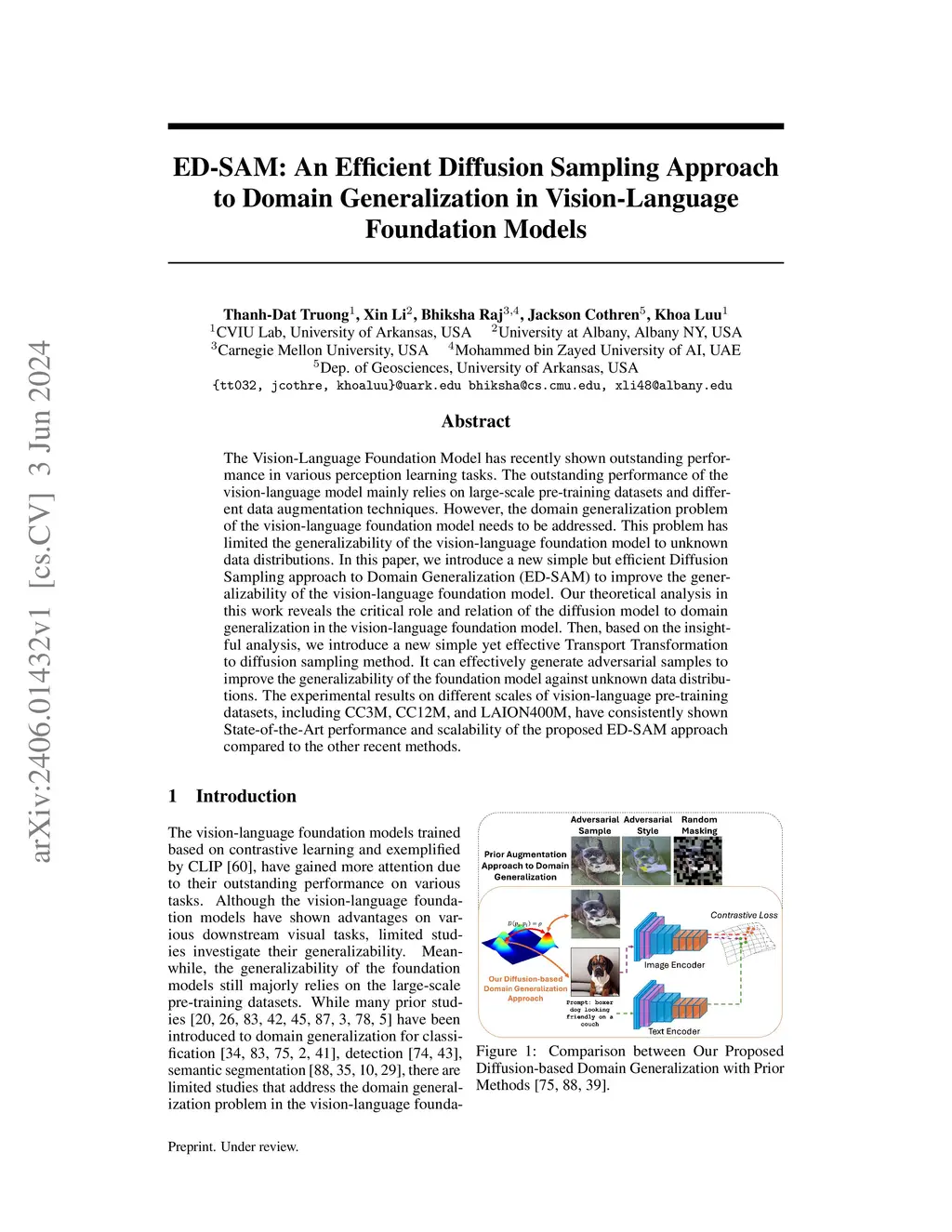 The Vision-Language Foundation Model has recently shown outstanding performance in various perception learning tasks. The outstanding performance of the vision-language model mainly relies on large-scale pre-training datasets and different data augmentation techniques. However, the domain generalization problem of the vision-language foundation model needs to be addressed. This problem has limited the generalizability of the vision-language foundation model to unknown data distributions. In this paper, we introduce a new simple but efficient Diffusion Sampling approach to Domain Generalization (ED-SAM) to improve the generalizability of the vision-language foundation model. Our theoretical analysis in this work reveals the critical role and relation of the diffusion model to domain generalization in the vision-language foundation model. Then, based on the insightful analysis, we introduce a new simple yet effective Transport Transformation to diffusion sampling method. It can effectively generate adversarial samples to improve the generalizability of the foundation model against unknown data distributions. The experimental results on different scales of vision-language pre-training datasets, including CC3M, CC12M, and LAION400M, have consistently shown State-of-the-Art performance and scalability of the proposed ED-SAM approach compared to the other recent methods.
