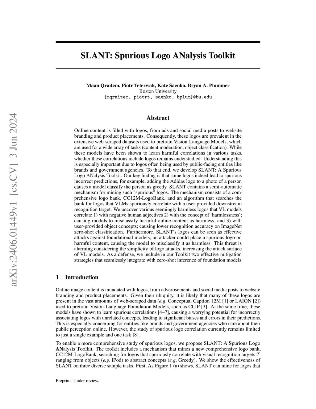 Online content is filled with logos, from ads and social media posts to website branding and product placements. Consequently, these logos are prevalent in the extensive web-scraped datasets used to pretrain Vision-Language Models, which are used for a wide array of tasks (content moderation, object classification). While these models have been shown to learn harmful correlations in various tasks, whether these correlations include logos remains understudied. Understanding this is especially important due to logos often being used by public-facing entities like brands and government agencies. To that end, we develop SLANT: A Spurious Logo ANalysis Toolkit. Our key finding is that some logos indeed lead to spurious incorrect predictions, for example, adding the Adidas logo to a photo of a person causes a model classify the person as greedy. SLANT contains a semi-automatic mechanism for mining such "spurious" logos. The mechanism consists of a comprehensive logo bank, CC12M-LogoBank, and an algorithm that searches the bank for logos that VLMs spuriously correlate with a user-provided downstream recognition target. We uncover various seemingly harmless logos that VL models correlate 1) with negative human adjectives 2) with the concept of `harmlessness'; causing models to misclassify harmful online content as harmless, and 3) with user-provided object concepts; causing lower recognition accuracy on ImageNet zero-shot classification. Furthermore, SLANT's logos can be seen as effective attacks against foundational models; an attacker could place a spurious logo on harmful content, causing the model to misclassify it as harmless. This threat is alarming considering the simplicity of logo attacks, increasing the attack surface of VL models. As a defense, we include in our Toolkit two effective mitigation strategies that seamlessly integrate with zero-shot inference of foundation models.