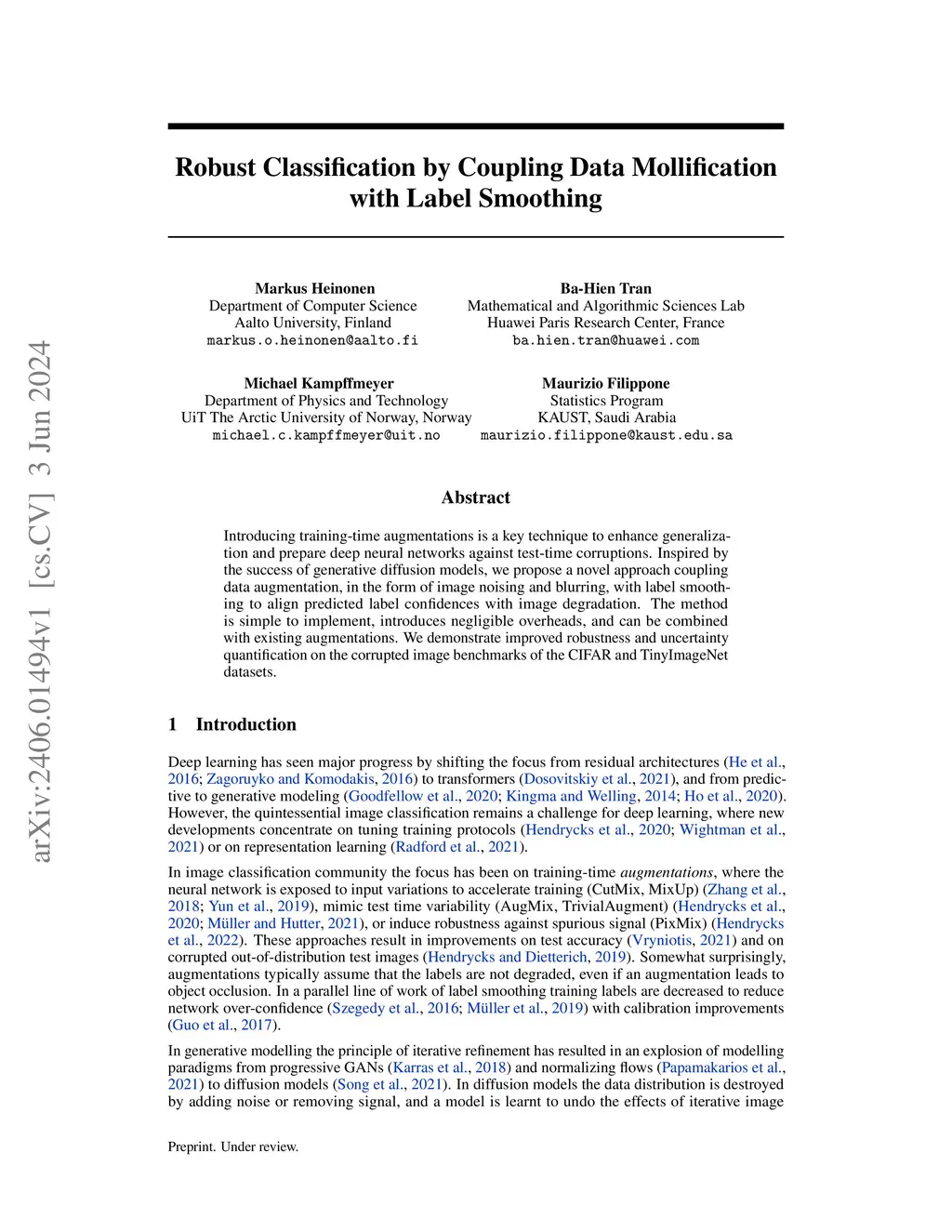 Robust Classification by Coupling Data Mollification with Label Smoothing