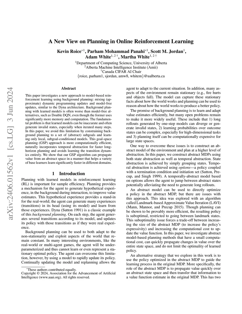 This paper investigates a new approach to model-based reinforcement learning using background planning: mixing (approximate) dynamic programming updates and model-free updates, similar to the Dyna architecture. Background planning with learned models is often worse than model-free alternatives, such as Double DQN, even though the former uses significantly more memory and computation. The fundamental problem is that learned models can be inaccurate and often generate invalid states, especially when iterated many steps. In this paper, we avoid this limitation by constraining background planning to a set of (abstract) subgoals and learning only local, subgoal-conditioned models. This goal-space planning (GSP) approach is more computationally efficient, naturally incorporates temporal abstraction for faster long-horizon planning and avoids learning the transition dynamics entirely. We show that our GSP algorithm can propagate value from an abstract space in a manner that helps a variety of base learners learn significantly faster in different domains.