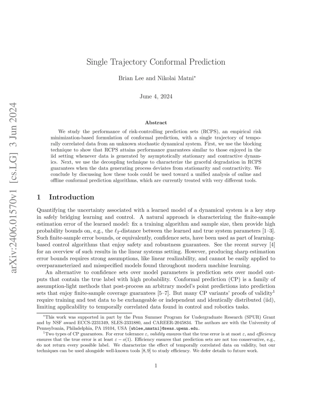 We study the performance of risk-controlling prediction sets (RCPS), an empirical risk minimization-based formulation of conformal prediction, with a single trajectory of temporally correlated data from an unknown stochastic dynamical system. First, we use the blocking technique to show that RCPS attains performance guarantees similar to those enjoyed in the iid setting whenever data is generated by asymptotically stationary and contractive dynamics. Next, we use the decoupling technique to characterize the graceful degradation in RCPS guarantees when the data generating process deviates from stationarity and contractivity. We conclude by discussing how these tools could be used toward a unified analysis of online and offline conformal prediction algorithms, which are currently treated with very different tools.