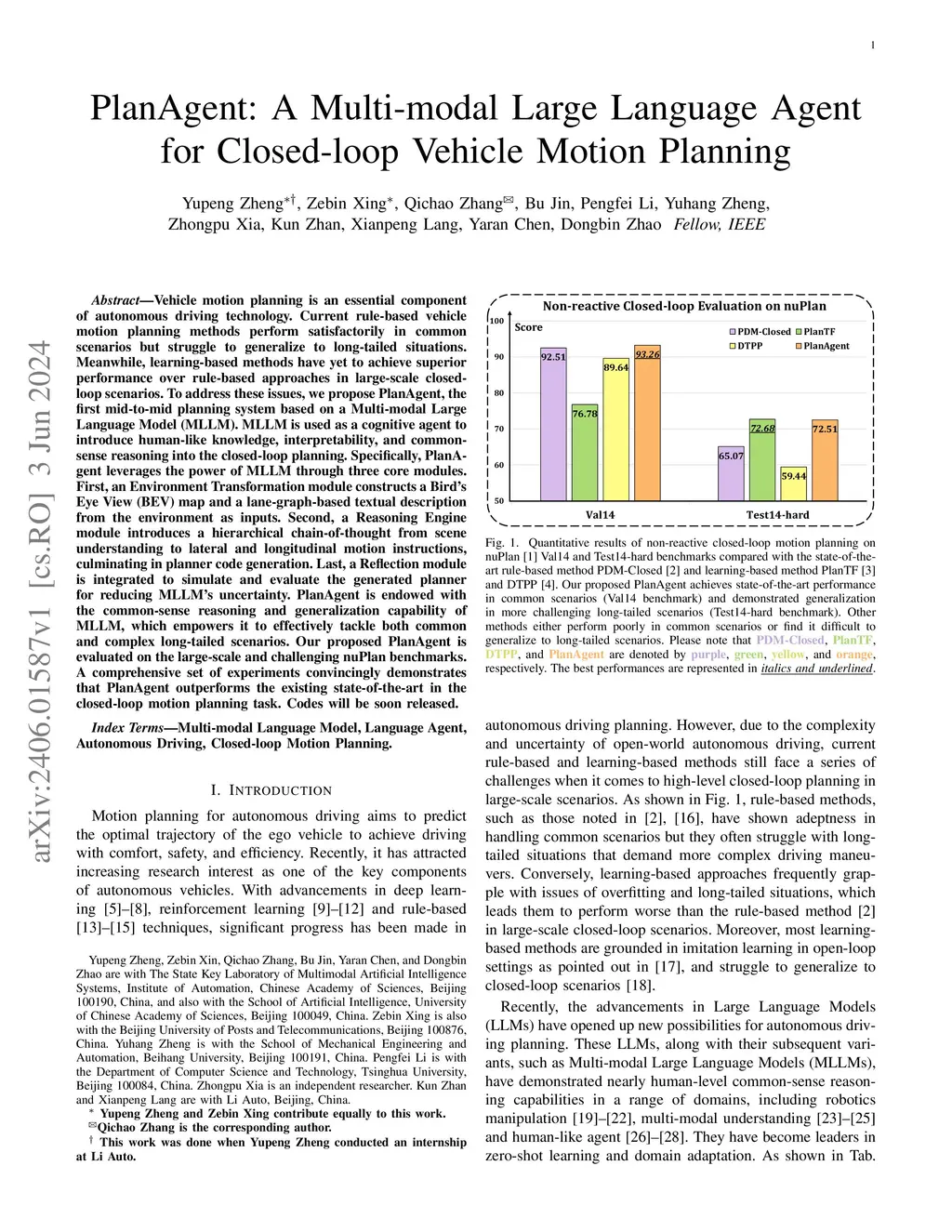 Vehicle motion planning is an essential component of autonomous driving technology. Current rule-based vehicle motion planning methods perform satisfactorily in common scenarios but struggle to generalize to long-tailed situations. Meanwhile, learning-based methods have yet to achieve superior performance over rule-based approaches in large-scale closed-loop scenarios. To address these issues, we propose PlanAgent, the first mid-to-mid planning system based on a Multi-modal Large Language Model (MLLM). MLLM is used as a cognitive agent to introduce human-like knowledge, interpretability, and common-sense reasoning into the closed-loop planning. Specifically, PlanAgent leverages the power of MLLM through three core modules. First, an Environment Transformation module constructs a Bird's Eye View (BEV) map and a lane-graph-based textual description from the environment as inputs. Second, a Reasoning Engine module introduces a hierarchical chain-of-thought from scene understanding to lateral and longitudinal motion instructions, culminating in planner code generation. Last, a Reflection module is integrated to simulate and evaluate the generated planner for reducing MLLM's uncertainty. PlanAgent is endowed with the common-sense reasoning and generalization capability of MLLM, which empowers it to effectively tackle both common and complex long-tailed scenarios. Our proposed PlanAgent is evaluated on the large-scale and challenging nuPlan benchmarks. A comprehensive set of experiments convincingly demonstrates that PlanAgent outperforms the existing state-of-the-art in the closed-loop motion planning task. Codes will be soon released.