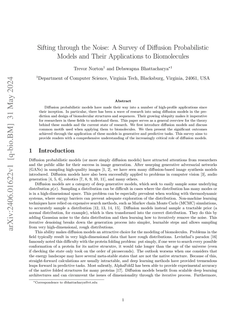 Diffusion probabilistic models have made their way into a number of high-profile applications since their inception. In particular, there has been a wave of research into using diffusion models in the prediction and design of biomolecular structures and sequences. Their growing ubiquity makes it imperative for researchers in these fields to understand them. This paper serves as a general overview for the theory behind these models and the current state of research. We first introduce diffusion models and discuss common motifs used when applying them to biomolecules. We then present the significant outcomes achieved through the application of these models in generative and predictive tasks. This survey aims to provide readers with a comprehensive understanding of the increasingly critical role of diffusion models.