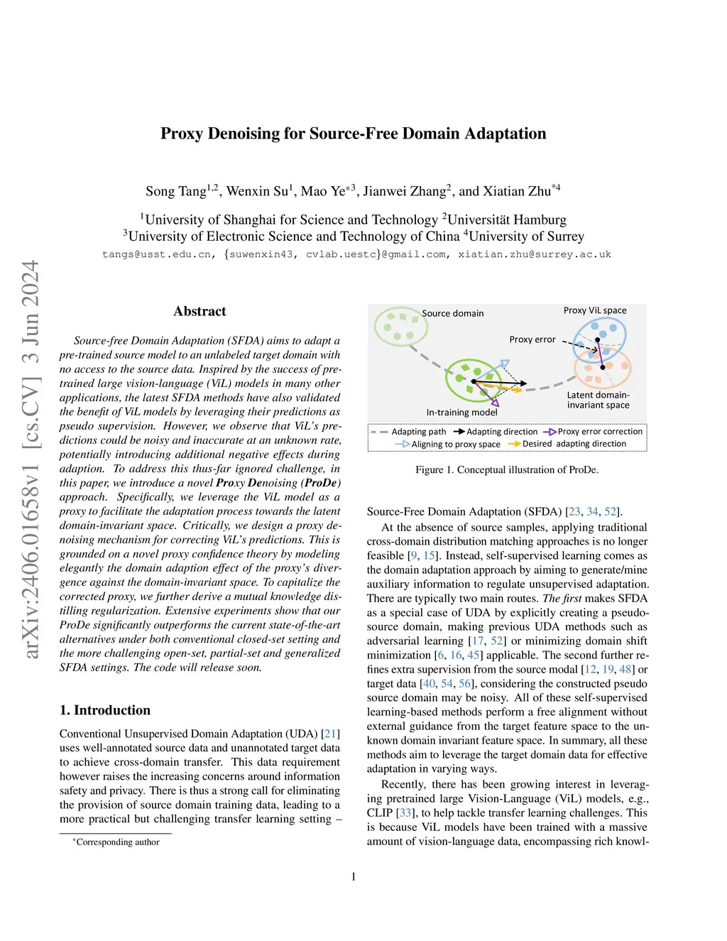 Source-Free Domain Adaptation (SFDA) aims to adapt a pre-trained source model to an unlabeled target domain with no access to the source data. Inspired by the success of large Vision-Language (ViL) models in many applications, the latest research has validated ViL's benefit for SFDA by using their predictions as pseudo supervision. However, we observe that ViL's supervision could be noisy and inaccurate at an unknown rate, introducing additional negative effects during adaption. To address this thus-far ignored challenge, we introduce a novel Proxy Denoising (ProDe) approach. The key idea is to leverage the ViL model as a proxy to facilitate the adaptation process towards the latent domain-invariant space. We design a proxy denoising mechanism to correct ViL's predictions, grounded on a proxy confidence theory that models the dynamic effect of proxy's divergence against the domain-invariant space during adaptation. To capitalize on the corrected proxy, we derive a mutual knowledge distilling regularization. Extensive experiments show that ProDe significantly outperforms current state-of-the-art alternatives under the conventional closed set setting and more challenging open set, partial set, generalized SFDA, multi-target, multi-source, and test-time settings. Our code and data are available atthis https URL.