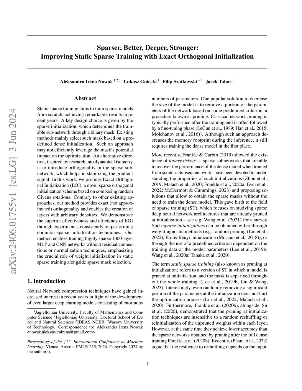 Static sparse training aims to train sparse models from scratch, achieving remarkable results in recent years. A key design choice is given by the sparse initialization, which determines the trainable sub-network through a binary mask. Existing methods mainly select such mask based on a predefined dense initialization. Such an approach may not efficiently leverage the mask's potential impact on the optimization. An alternative direction, inspired by research into dynamical isometry, is to introduce orthogonality in the sparse subnetwork, which helps in stabilizing the gradient signal. In this work, we propose Exact Orthogonal Initialization (EOI), a novel sparse orthogonal initialization scheme based on composing random Givens rotations. Contrary to other existing approaches, our method provides exact (not approximated) orthogonality and enables the creation of layers with arbitrary densities. We demonstrate the superior effectiveness and efficiency of EOI through experiments, consistently outperforming common sparse initialization techniques. Our method enables training highly sparse 1000-layer MLP and CNN networks without residual connections or normalization techniques, emphasizing the crucial role of weight initialization in static sparse training alongside sparse mask selection. The code is available at https://github.com/woocash2/sparser-better-deeper-stronger