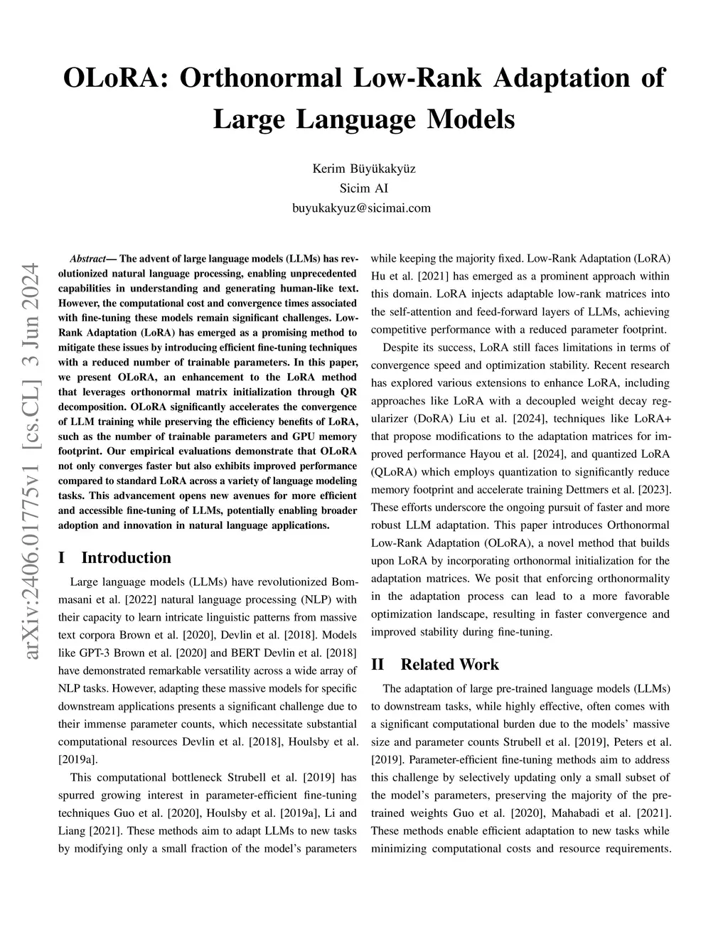 The advent of large language models (LLMs) has revolutionized natural language processing, enabling unprecedented capabilities in understanding and generating human-like text. However, the computational cost and convergence times associated with fine-tuning these models remain significant challenges. Low-Rank Adaptation (LoRA) has emerged as a promising method to mitigate these issues by introducing efficient fine-tuning techniques with a reduced number of trainable parameters. In this paper, we present OLoRA, an enhancement to the LoRA method that leverages orthonormal matrix initialization through QR decomposition. OLoRA significantly accelerates the convergence of LLM training while preserving the efficiency benefits of LoRA, such as the number of trainable parameters and GPU memory footprint. Our empirical evaluations demonstrate that OLoRA not only converges faster but also exhibits improved performance compared to standard LoRA across a variety of language modeling tasks. This advancement opens new avenues for more efficient and accessible fine-tuning of LLMs, potentially enabling broader adoption and innovation in natural language applications.