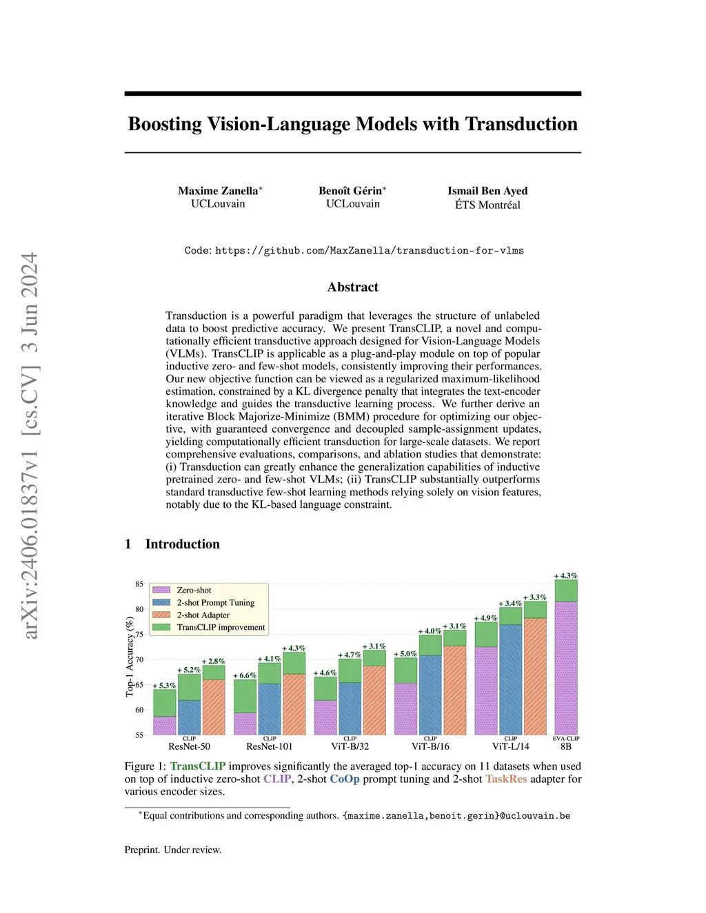 Transduction is a powerful paradigm that leverages the structure of unlabeled data to boost predictive accuracy. We present TransCLIP, a novel and computationally efficient transductive approach designed for Vision-Language Models (VLMs). TransCLIP is applicable as a plug-and-play module on top of popular inductive zero- and few-shot models, consistently improving their performances. Our new objective function can be viewed as a regularized maximum-likelihood estimation, constrained by a KL divergence penalty that integrates the text-encoder knowledge and guides the transductive learning process. We further derive an iterative Block Majorize-Minimize (BMM) procedure for optimizing our objective, with guaranteed convergence and decoupled sample-assignment updates, yielding computationally efficient transduction for large-scale datasets. We report comprehensive evaluations, comparisons, and ablation studies that demonstrate: (i) Transduction can greatly enhance the generalization capabilities of inductive pretrained zero- and few-shot VLMs; (ii) TransCLIP substantially outperforms standard transductive few-shot learning methods relying solely on vision features, notably due to the KL-based language constraint.